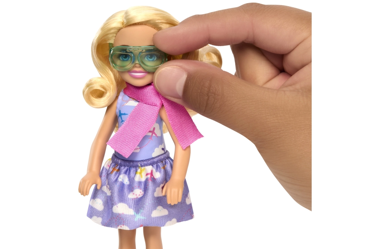 Η κούκλα φοράει χαριτωμένο φόρεμα με στάμπα σύννεφα, κομψό ροζ φουλάρι και προστατευτικά γυαλιά. Τα αξεσουάρ – βαλίτσα, αυτοκόλλητα και γυαλιά για την κούκλα και το σκυλάκι – απογειώνουν το παιχνίδι σε θεματικές αποστολές, ταξίδια και αφήγηση προσωπικών ιστοριών. Ιδανικό δώρο για παιδιά από 3 ετών που αγαπούν τα αεροπλάνα, τα ταξίδια και τον κόσμο της BARBIE και της CHELSEA.