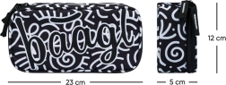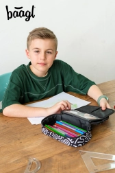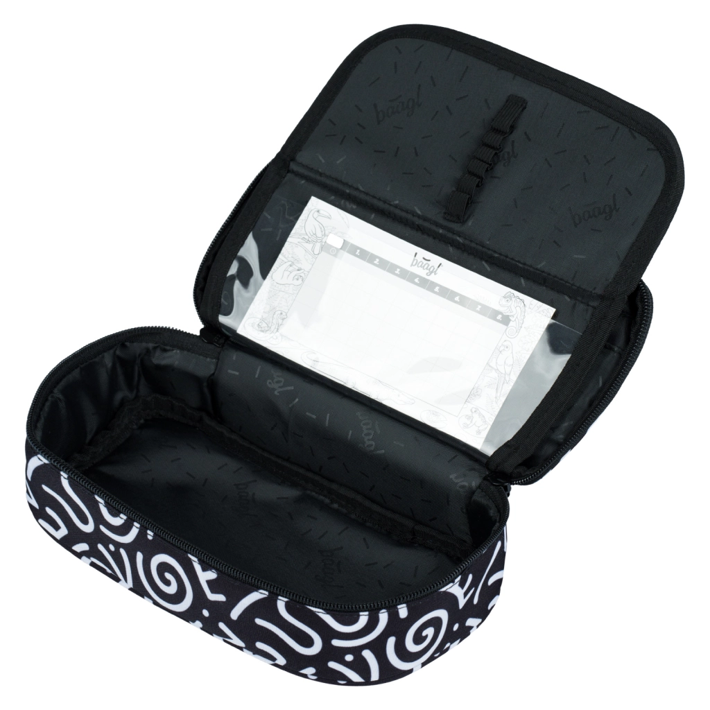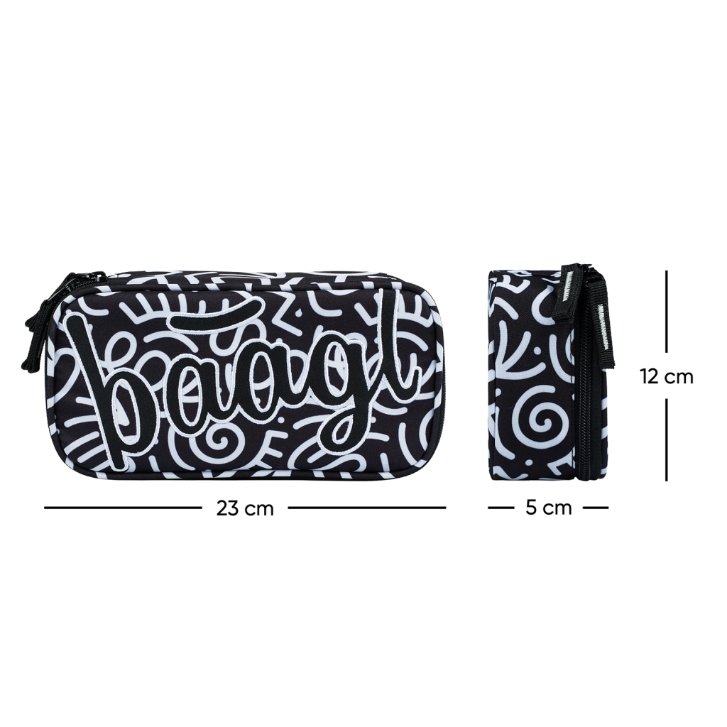 Η κασετίνα ξεχωρίζει με ασπρόμαυρη υφασμάτινη εμφάνιση, αφηρημένα μοτίβα και την επιγραφή 'Baagl'. Ο κομψός της σχεδιασμός είναι ιδανικός για όσους δίνουν σημασία στη μόδα ακόμη και στα σχολικά είδη.