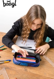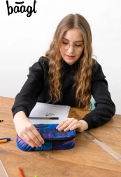 Με μπλε-μωβ μοτίβο και το λογότυπο baagl, αυτή η κασετίνα προσφέρει μοντέρνα αισθητική και λειτουργικότητα σε ένα.