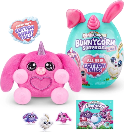 Μικρό αλλά μαγικό – το κουνελάκι Boo‑Boocorn από τη σειρά RAINBOCORNS προσφέρει στα παιδιά χαρά από τις εκπλήξεις και απαλές αγκαλιές. Σε κάθε αυγό θα βρείτε ένα λούτρινο κουνελάκι με λαμπερά αυτιά, φουντωτή ουρά και άλλα μικρά αξεσουάρ για παιχνίδι και συλλογή.