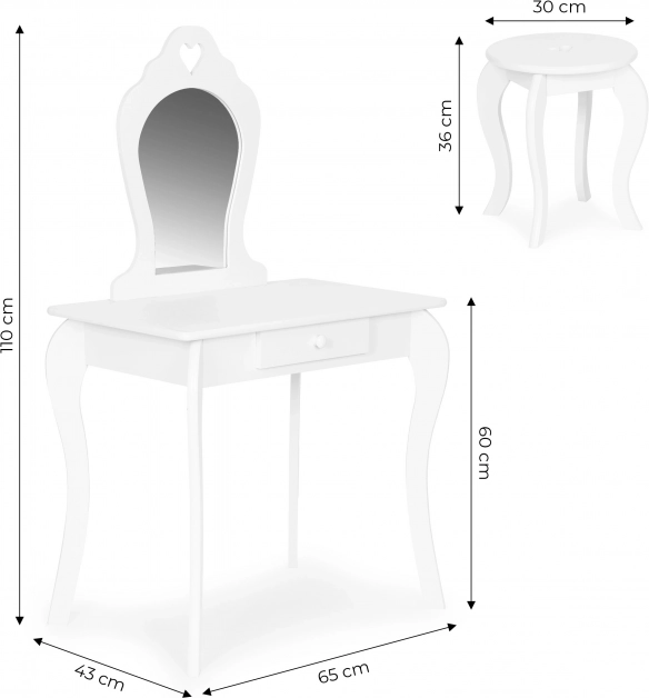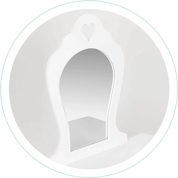 Δημιουργήστε στα παιδιά τη δική τους γωνιά ομορφιάς. Αυτή η λευκή τουαλέτα με καρδιόσχημο καθρέφτη ταιριάζει όμορφα σε κάθε παιδικό δωμάτιο. Ανθεκτική και σταθερή κατασκευή από ξύλο και MDF για μεγάλη διάρκεια ζωής, ενώ οι λείες επιφάνειες καθαρίζονται εύκολα.