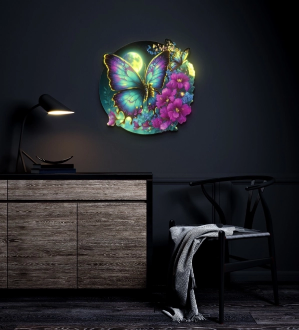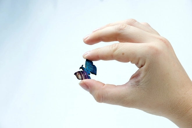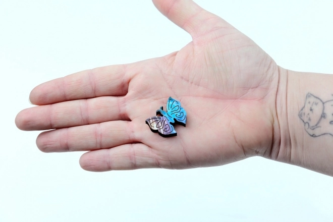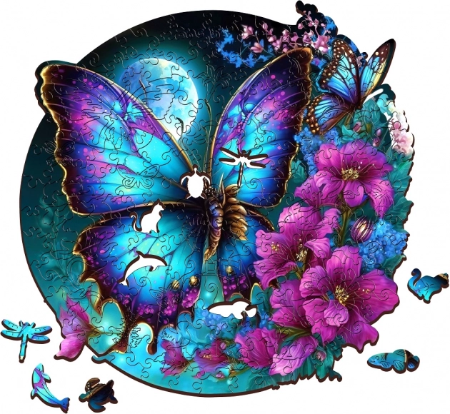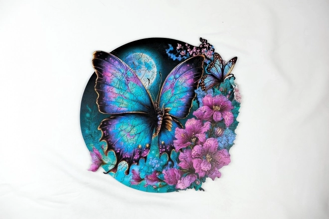Αυτό το στρογγυλό ξύλινο παζλ με εντυπωσιακό μοτίβο μπλε-μοβ πεταλούδας προσφέρει απόλυτα ευκρινή χρώματα χάρη στην ψηφιακή εκτύπωση UV και την προσεκτική χειροποίητη κατασκευή. Κάθε κομμάτι είναι μοναδικό, λείο στην αφή και εφαρμόζει με ακρίβεια, εξασφαλίζοντας ευχάριστη και αβίαστη συναρμολόγηση. Με διάμετρο 42 cm, το ολοκληρωμένο παζλ γίνεται ευφάνταστη διακόσμηση τοίχου.