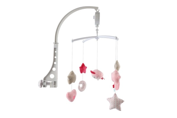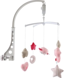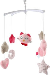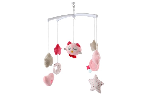 Ηρεμήστε το μωρό με την απαλή κίνηση και τη μελωδία που προσφέρει αυτό το ροζ μόμπιλε κούνιας με κουκουβάγια. Χάρη στο κουρδιστό μουσικό μηχανισμό και στα μαλακά κρεμαστά στοιχεία (αστεράκια, καρδιές, φεγγαράκι) βοηθά να απασχολεί και να νανουρίζει τα παιδιά. Η εύκολη τοποθέτηση στην κούνια και οι απαλές παστέλ αποχρώσεις ταιριάζουν ιδανικά σε κάθε παιδικό δωμάτιο.