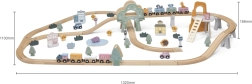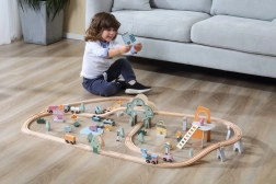 Το πλούσιο σετ περιλαμβάνει ράγες, ανυψώσεις, γέφυρα, τρενάκι με βαγόνια και πολλά αξεσουάρ. Τα παιδιά αλλάζουν εύκολα διαδρομές και δημιουργούν νέες ιστορίες σε κάθε παιχνίδι.