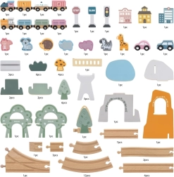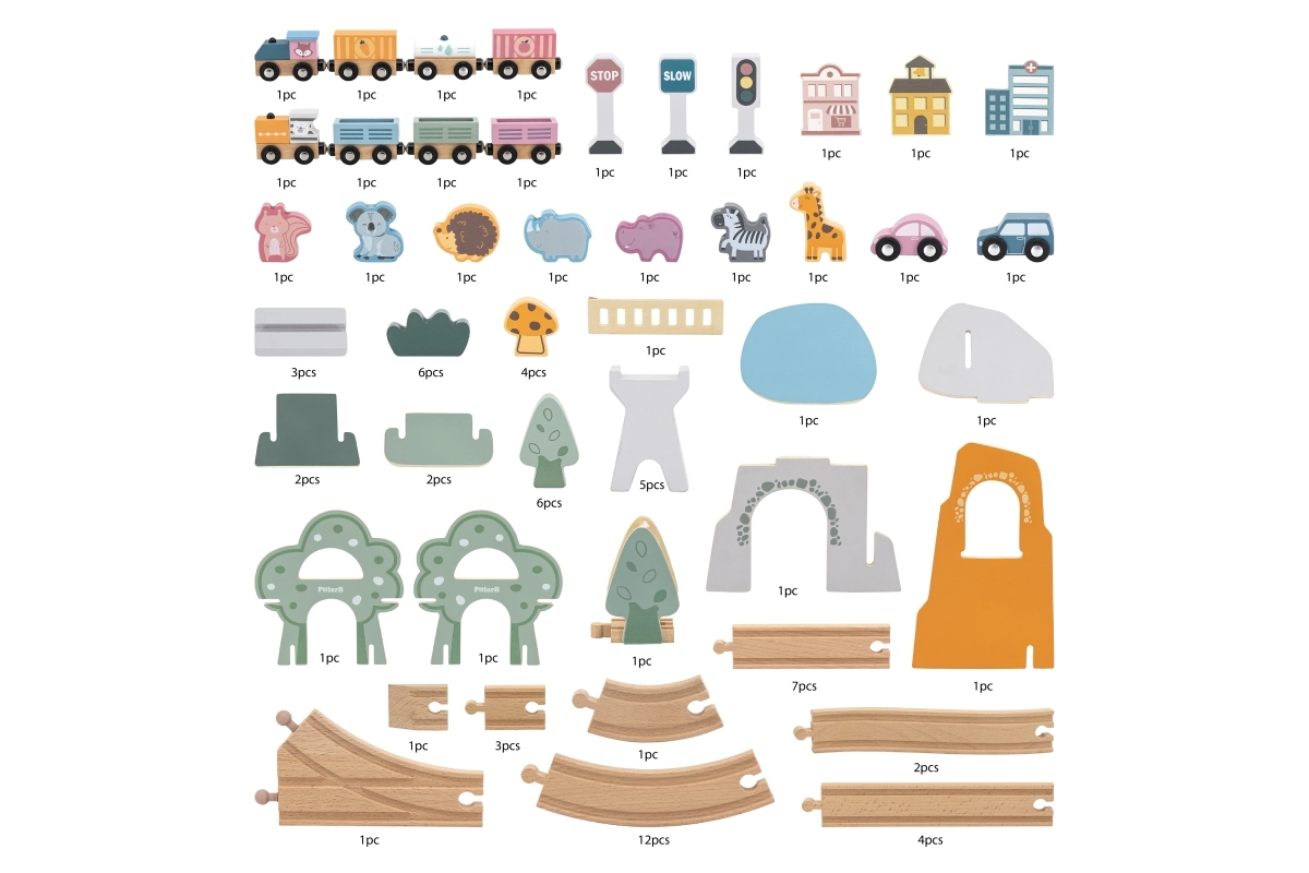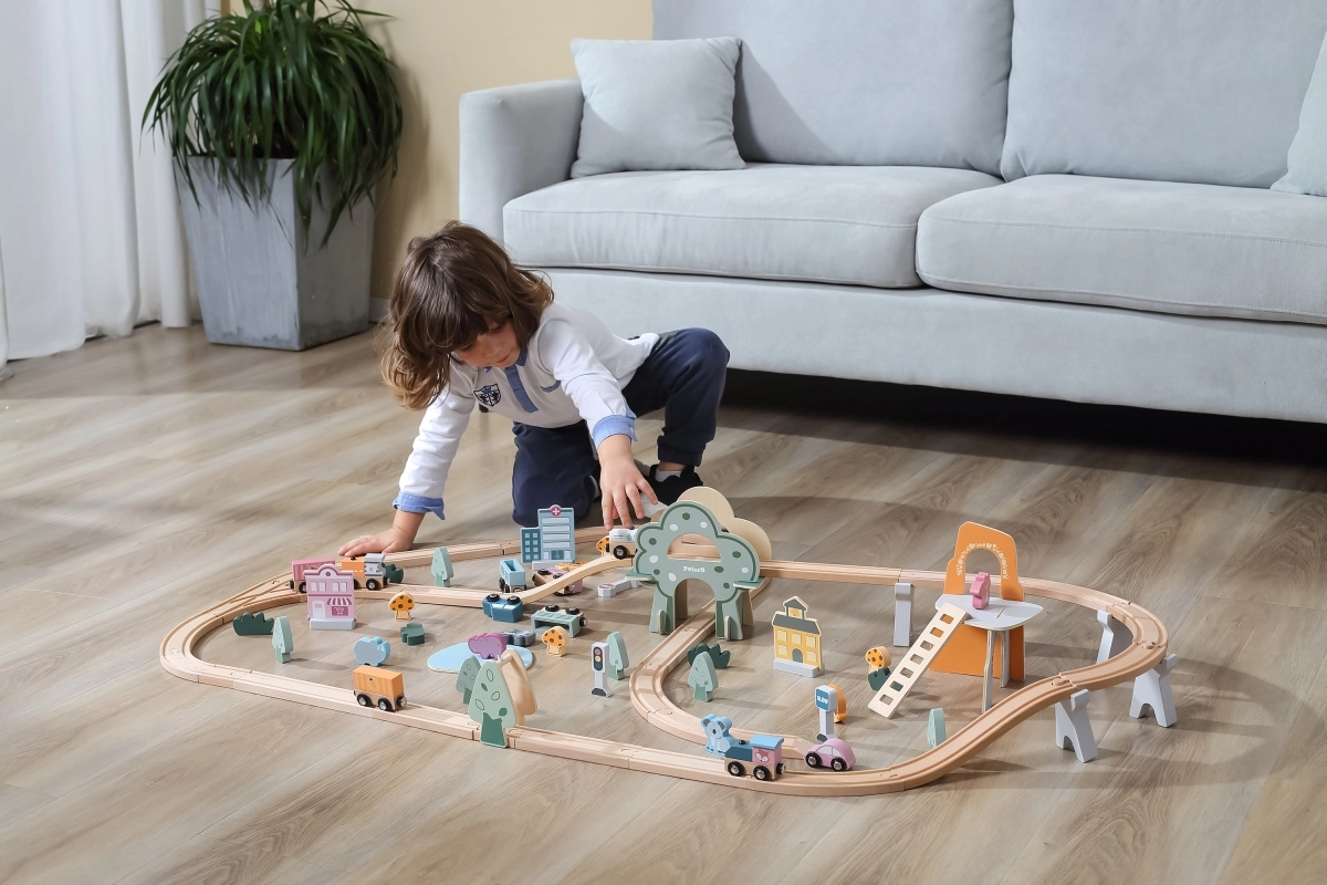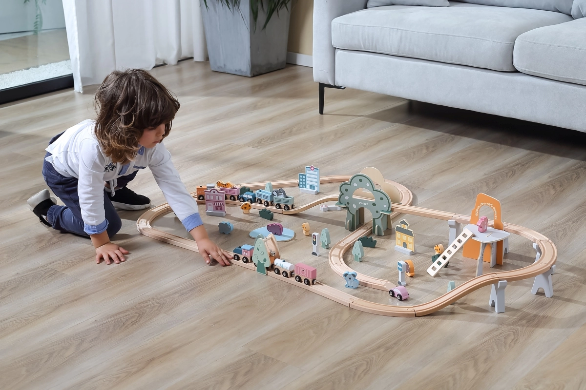 Το παιχνίδι είναι ασφαλές και ανθεκτικό: λείες άκρες, χρώματα με βάση το νερό και συμπαγές ξύλο, φιλικά προς τα παιδιά και το περιβάλλον. Χειριζόμενα τις ράγες και τα αξεσουάρ, τα παιδιά εξασκούν τον συντονισμό χεριού–ματιού, τη λογική σκέψη και τη συνεργασία στο ομαδικό παιχνίδι.