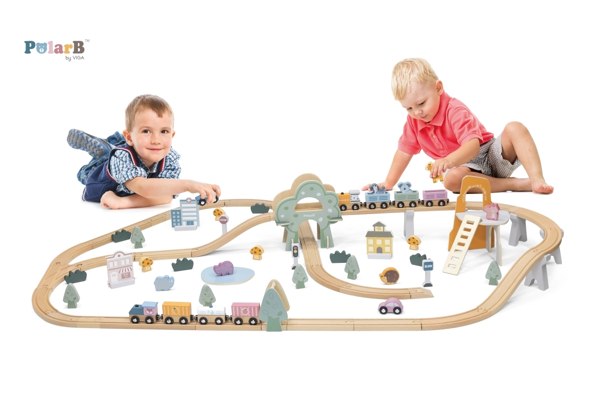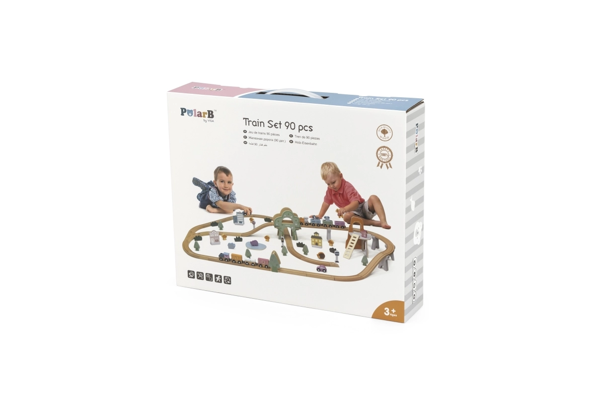 Ανακαλύψτε έναν κόσμο φαντασίας με τον ξύλινο σιδηρόδρομο POLARB. Το σετ περιλαμβάνει 90 προσεγμένα κομμάτια: ευθείες και καμπύλες ράγες, ανυψώσεις και γέφυρα, τρενάκι με βαγόνια, πινακίδες κυκλοφορίας, σπιτάκια, οχήματα, ζωάκια, δέντρα και βράχους. Χάρη στη εύκολη σύνδεση μπορούν να δημιουργηθούν αμέτρητες διαδρομές και σκηνές, τις οποίες τα παιδιά αλλάζουν και επεκτείνουν συνεχώς.
