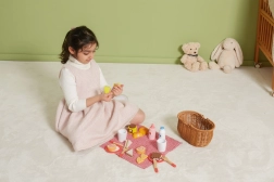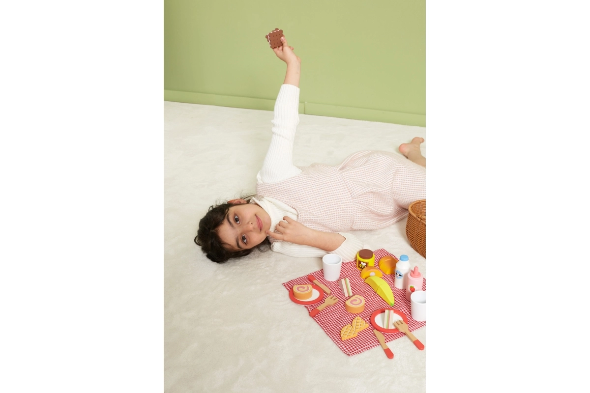Ό,τι χρειάζονται τα παιδιά: πιατάκια, κούπες, μαχαιροπήρουνα, αρτοσκευάσματα, φρούτα και «ποτά» – ιδανικό για παιχνίδι γιορτής και σερβιρίσματος.