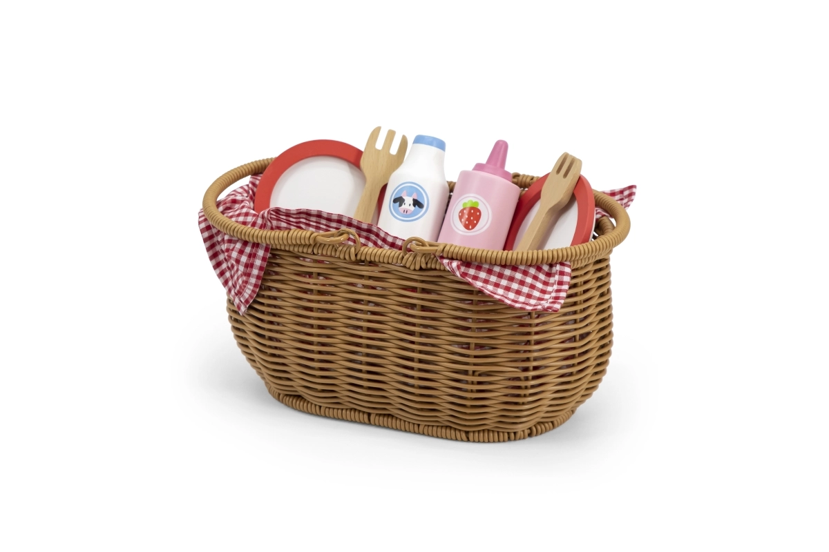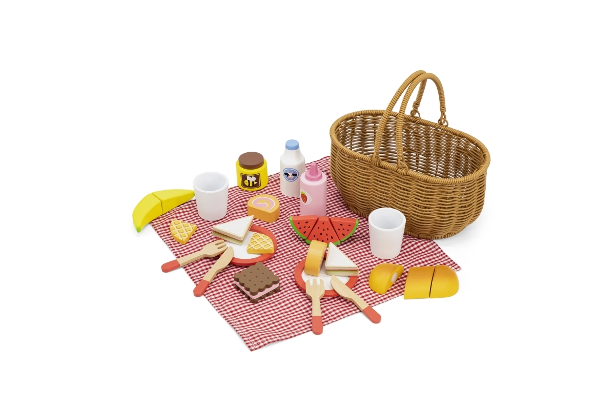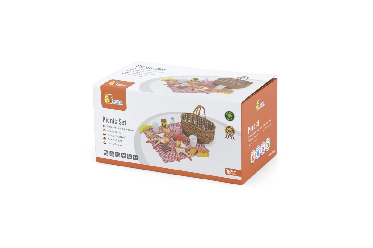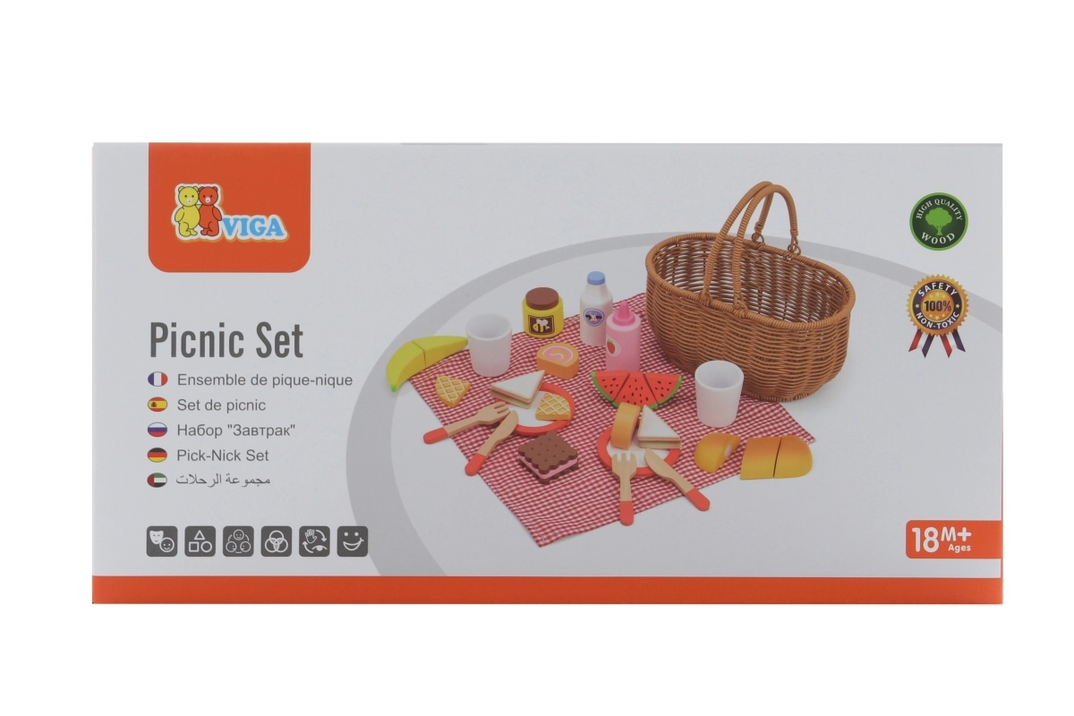 Το παιδικό σετ πικνίκ VIGA προσφέρει ό,τι χρειάζονται οι μικροί σεφ για το τέλειο πικνίκ. Το στιβαρό καλάθι από «πλεγμένο» συνθετικό ρατάν είναι ελαφρύ στη μεταφορά και μέσα θα βρείτε σερβίτσια, μαχαιροπήρουνα, ροφήματα και μια πολύχρωμη ποικιλία ξύλινων λιχουδιών. Κάποια τρόφιμα είναι διαιρούμενα σε κομμάτια και ενωμένα με βέλκρο, ώστε τα παιδιά να δοκιμάζουν με ασφάλεια «κόψιμο» και σερβίρισμα.