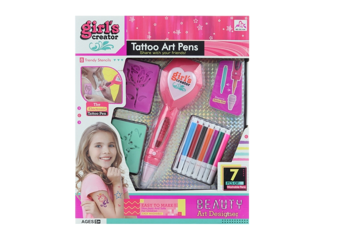 Δημιουργήστε τα δικά σας προσωρινά τατουάζ εύκολα και γρήγορα! Αυτό το δημιουργικό σετ τατουάζ για κορίτσια περιλαμβάνει 8 στένσιλ, ηλεκτρικό στυλό τατουάζ με μπαταρία και 7 χρωματιστούς μαρκαδόρους, ώστε να σχεδιάζετε πρωτότυπα μοτίβα σύμφωνα με τη φαντασία σας. Τροφοδοσία 2× AAA (δεν περιλαμβάνονται). Κατάλληλο από 5 ετών.