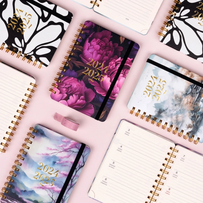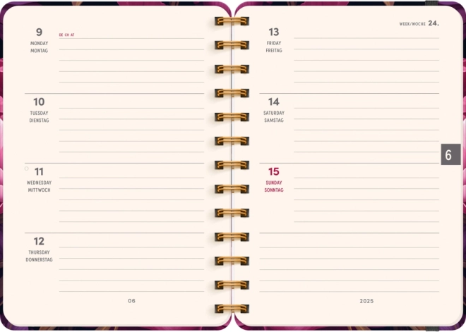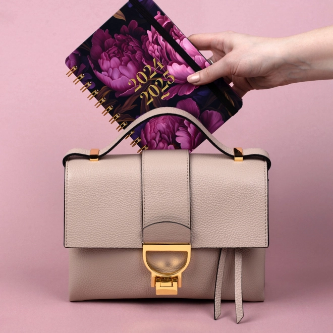 Πρακτικό ημερολόγιο 18 μηνών NOTIQUE Petito με μοτίβο μοβ λουλουδιών, προσφέρει επισκόπηση για τα έτη 2024 και 2025, ευανάγνωστο εβδομαδιαίο ημερολόγιο σε γραμμές στα αγγλικά και γερμανικά με αργίες και άφθονο χώρο για σημειώσεις. Ιδανικό μέγεθος 13 × 18 εκ. και ανθεκτική σπιράλ βιβλιοδεσία το καθιστούν κομψό σύντροφο για σχολείο, εργασία και ταξίδια.
