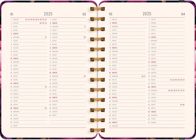 Χάρη στις συμπαγείς διαστάσεις 13 × 18 εκ., το ημερολόγιο χωρά εύκολα σε τσάντα ή σακίδιο, ενώ η σπιράλ βιβλιοδεσία επιτρέπει άνετο πλήρες άνοιγμα και βολική γραφή. Οι επισκοπήσεις για τα έτη 2024 και 2025 και η σήμανση αργιών διευκολύνουν τον προσανατολισμό και τον προγραμματισμό.