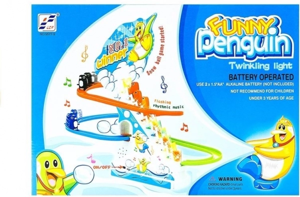 Οι πιγκουίνοι γλιστρούν στην πίστα ενώ παίζει μια χαρούμενη μελωδία, προσφέροντας ώρες χαράς και διασκέδασης για μικρά παιδιά.