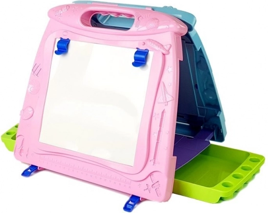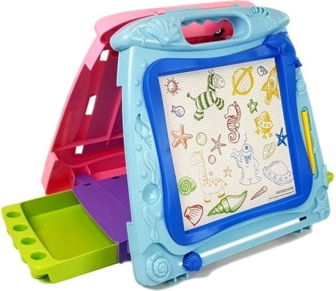 Ανακαλύψτε ένα διασκεδαστικό και πρακτικό εργαλείο για μικρούς καλλιτέχνες: διπλής όψης πίνακας ζωγραφικής, με μία πλευρά για γράψιμο με μαρκαδόρους και την άλλη για μαγνητικό σχέδιο με γραφίδα. Χάρη στη λειτουργία εύκολης διαγραφής με συρόμενο μηχανισμό, τα δύο πλαϊνά συρτάρια και την ελαφριά κατασκευή με χερούλι, είναι ιδανικός για το σπίτι και τα ταξίδια. Υποστηρίζει τη δημιουργικότητα, τη λεπτή κινητικότητα και τη μάθηση μέσω παιχνιδιού.