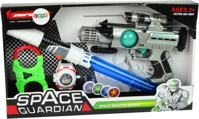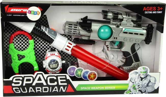 Το σετ διαστημικών όπλων Space Guardian είναι ένα πλήρες πακέτο για όλους τους μικρούς εξερευνητές. Είναι εξοπλισμένο όχι μόνο με πιστόλι λέιζερ, αλλά και με φωτεινό σπαθί, κατασκήνωσης αξεσουάρ και εκτοξευτή δίσκων για μια ολοκληρωμένη εμπειρία παιχνιδιού. Χάρη στα φωτεινά και ηχητικά εφέ, το παιχνίδι με αυτό το σετ γίνεται πιο συναρπαστικό και δημιουργικό.
