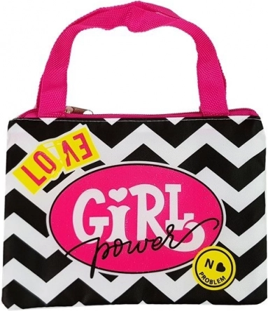 Μικρό τσαντάκι με ασπρόμαυρο ζιγκ-ζαγκ σχέδιο και ροζ επιγραφή 'Girl Power'.