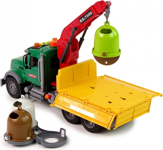 Αυτό το λεπτομερώς κατασκευασμένο απορριματοφόρο μεταφέρει ό,τι χρειάζεται – από τα παρεχόμενα κοντέινερ μέχρι μικρά παιχνίδια. Το πίσω ρυμουλκούμενο διαθέτει κινούμενο γερανό που σηκώνει και τοποθετεί εύκολα τα κοντέινερ. Στην οροφή της καμπίνας θα βρείτε πλήκτρο χειρισμού για ενεργοποίηση του βραχίονα του γερανού και των εφέ.