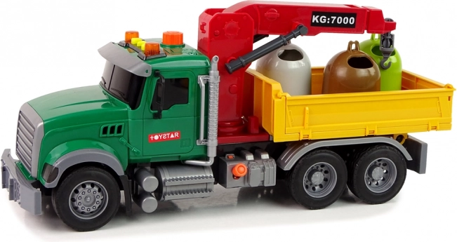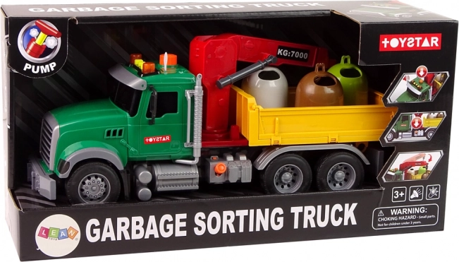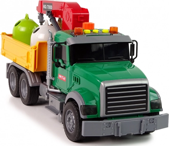 Ρεαλιστικές φωτεινές και ηχητικές λειτουργίες (φάροι, κόρνα, οπισθοπορεία) χαρίζουν στο παιχνίδι την αυθεντική ατμόσφαιρα των εργατικών μηχανημάτων. Το παιχνίδι έχει εκπαιδευτική αξία – τα παιδιά μαθαίνουν τις αρχές της οικολογίας και του διαχωρισμού απορριμμάτων, αναπτύσσουν τη λεπτή κινητικότητα και τη φαντασία.