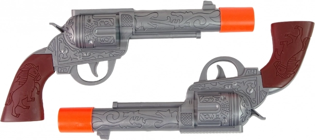 Αυτός ο πλήρης εξοπλισμός καουμπόη μεταμορφώνει κάθε παιδί σε θαρραλέο προστάτη της τάξης. Με το πάτημα της σκανδάλης, το περίστροφο παράγει ρεαλιστικό ήχο πυροβολισμού (τροφοδοσία AG13), ενώ η ζώνη με θήκες κρατά τα πιστόλια πάντα πρόχειρα. Τα ασφαλή πορτοκαλί άκρα και το ποιοτικό πλαστικό εξασφαλίζουν ξέγνοιαστο παιχνίδι μέσα και έξω.