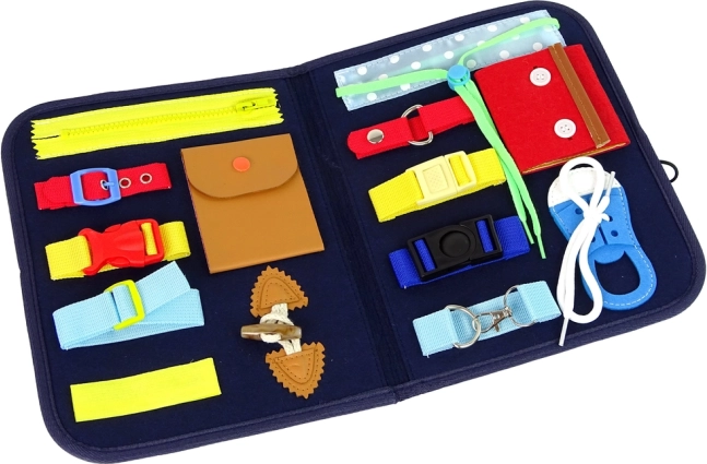 Η επιφάνεια περιλαμβάνει μια σειρά από στοιχεία σε διαφορετικά σχήματα και υφές, που βοηθούν στη βελτίωση της απτικής αντίληψης. Διαθέτει διάφορους τύπους δεσιμάτων, όπως κουμπιά, πόρπες και κορδόνια, που ενισχύουν τη δημιουργικότητα των παιδιών και τα διδάσκουν να διαχειρίζονται αυτόνομα καθημερινές δραστηριότητες.