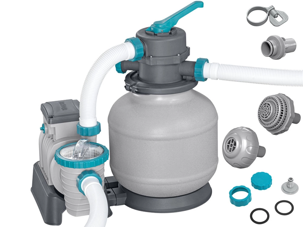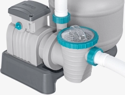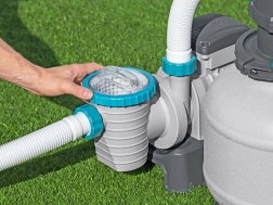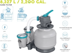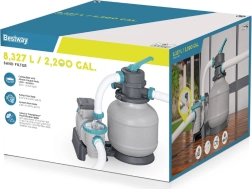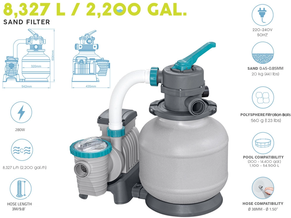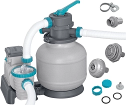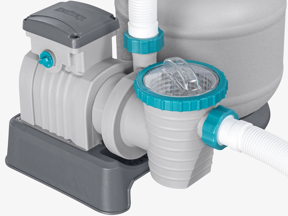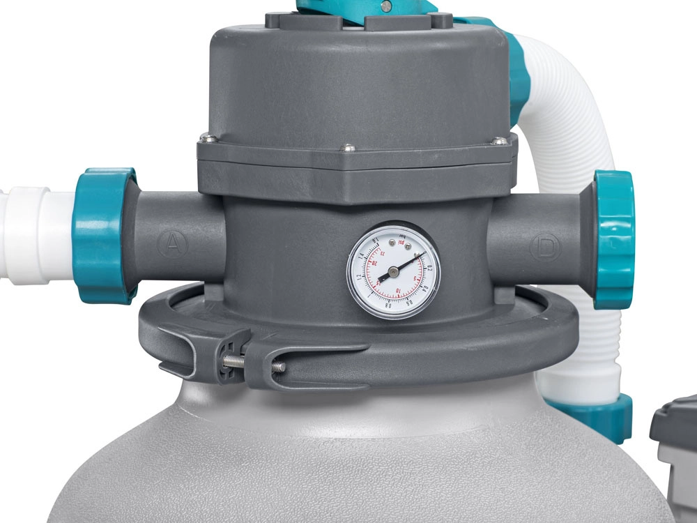 Ισχυρό φίλτρο άμμου BESTWAY με παροχή 8327 l/h διατηρεί το νερό της πισίνας κρυστάλλινα καθαρό. Προσφέρει πολυλειτουργική βαλβίδα 6 θέσεων, μανόμετρο για εύκολο έλεγχο πίεσης και αυτόματο χρονοδιακόπτη. Συμβατό με πυριτική άμμο 0,45–0,85 mm και σφαιρίδια φίλτρανσης, ιδανικό για πισίνες όγκου 1 100–54 500 l.