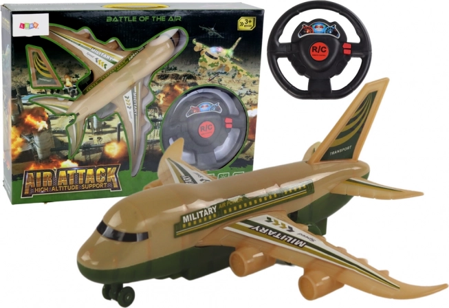 Διασκεδαστικό παιχνίδι σε μορφή τηλεκατευθυνόμενου αεροπλάνου, εξοπλισμένο με στρατιωτική παραλλαγή σε αποχρώσεις καφέ και πράσινου, προσφέρει στα παιδιά ατελείωτες περιπέτειες. Με στιβαρή κατασκευή και έμφαση στη λεπτομέρεια θα ευχαριστήσει όλους τους μικρούς λάτρεις της αεροπορίας. Χάρη στο συμπεριλαμβανόμενο χειριστήριο, τα παιδιά αναλαμβάνουν εύκολα τον έλεγχο της πτήσης. Ο χειρισμός είναι προσαρμοσμένος και για μικρά χεράκια, κάτι που εξασφαλίζει εύκολη χρήση.