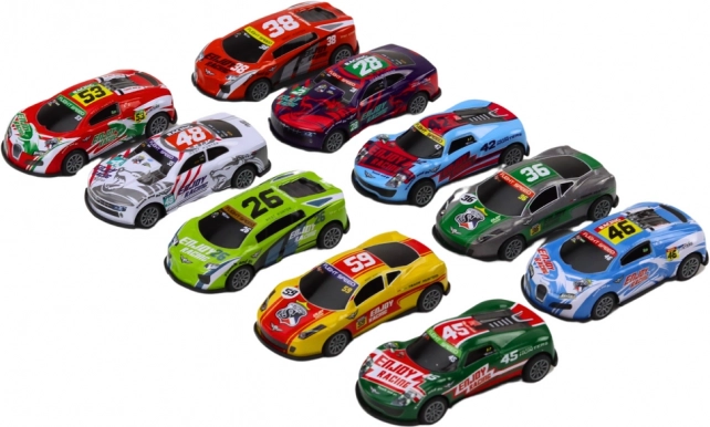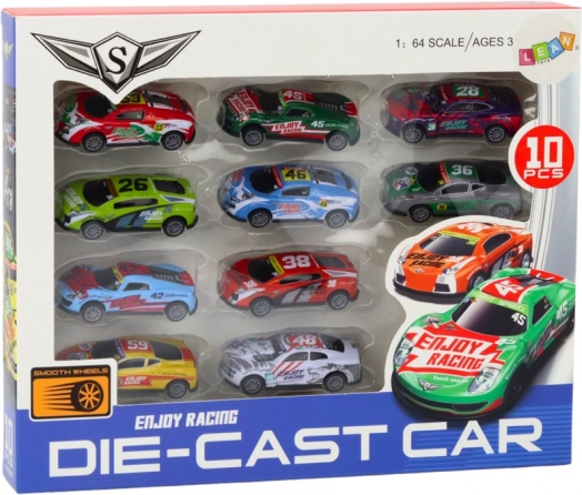 Το σετ περιλαμβάνει δέκα αυτοκινητάκια σε διάφορα χρώματα και σχέδια, προσθέτοντας νέα διάσταση στο αγωνιστικό σας παιχνίδι.