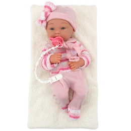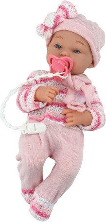 Χαριτωμένο κουκλάκι μωρό με ροζ ρουχαλάκια που θα χαρίσει χαρά σε κάθε μικρή φροντίστρια. Διαθέτει κινούμενα χέρια και πόδια, ρεαλιστικές λεπτομέρειες προσώπου και πρακτικά αξεσουάρ, όπως πιπίλα σε κορδόνι και απαλή κουβερτούλα. Κατασκευασμένο από ασφαλή υλικά, κατάλληλο από 18 μηνών.