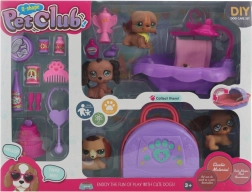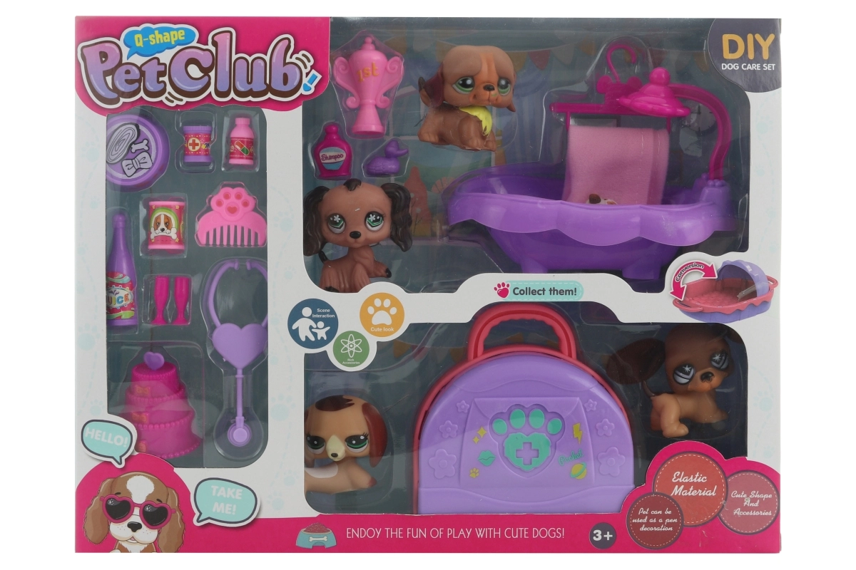 Αυτό το πολύχρωμο σετ σκυλιών με αξεσουάρ μετατρέπει το παιδικό δωμάτιο σε ένα μικρό σαλόνι ομορφιάς και ζωικής φροντίδας. Τα παιδιά μπορούν να κάνουν μπάνιο τα σκυλάκια στη μικρή μπανιέρα, να τα σκουπίζουν με πετσέτα, να τα ταΐζουν και να τα βάζουν για ύπνο στο μαλακό κρεβατάκι, κρυμμένο στο πρακτικό βαλιτσάκι. Όλα είναι φτιαγμένα από ανθεκτικό πλαστικό και προσαρμοσμένα στα μικρά παιδικά χεράκια.
