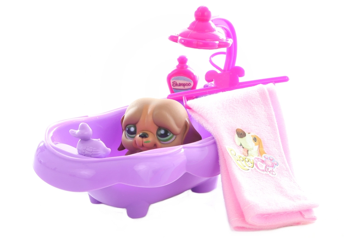 Η μικρή μπανιέρα με ντους, η πετσέτα και το «σαμπουάν» επιτρέπουν στα παιδιά να αναπαραστήσουν την καθημερινή φροντίδα του κατοικιδίου και να αναπτύξουν ενσυναίσθηση και λεπτή κινητικότητα.