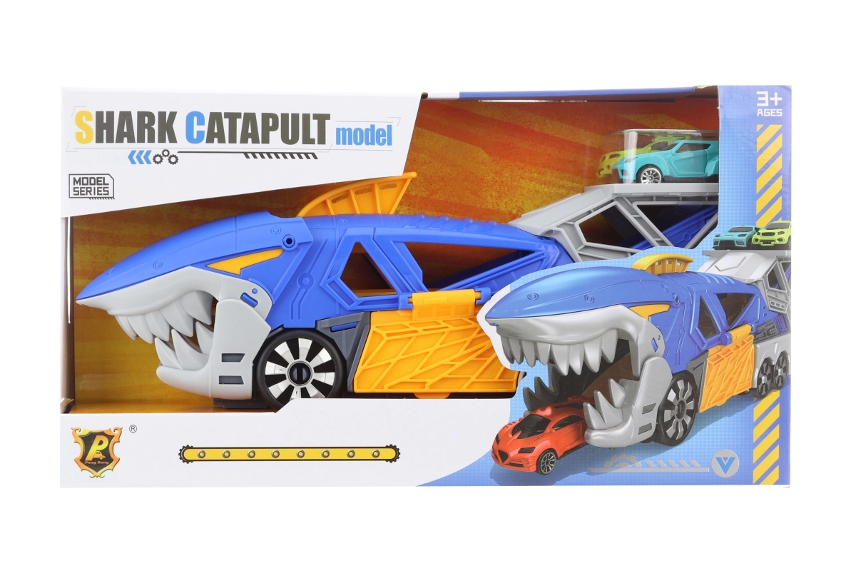 Διασκεδαστική πίστα αυτοκινήτων με θέμα τον καρχαρία που μετατρέπει κάθε απόγευμα σε αγωνιστικό σόου. Το μεγάλο αυτοκίνητο σε σχήμα καρχαρία λειτουργεί ως εκτοξευτής και, χάρη στον μηχανισμό με λάστιχο, στέλνει τα συνοδευτικά αυτοκινητάκια μπροστά. Η συσκευασία περιλαμβάνει ένα μεγάλο αυτοκίνητο και 2 μικρά αυτοκινητάκια, είναι κατασκευασμένη από ανθεκτικό πλαστικό και είναι κατάλληλη για παιδιά από 3 ετών.