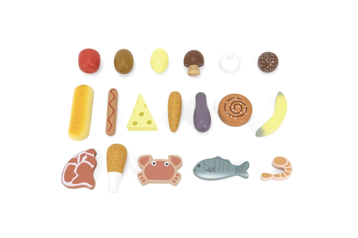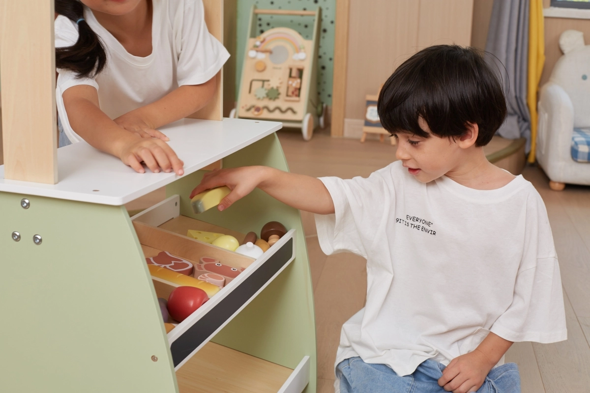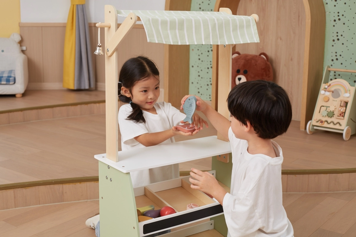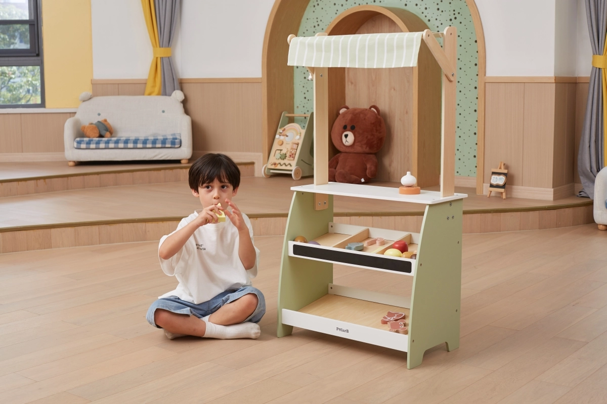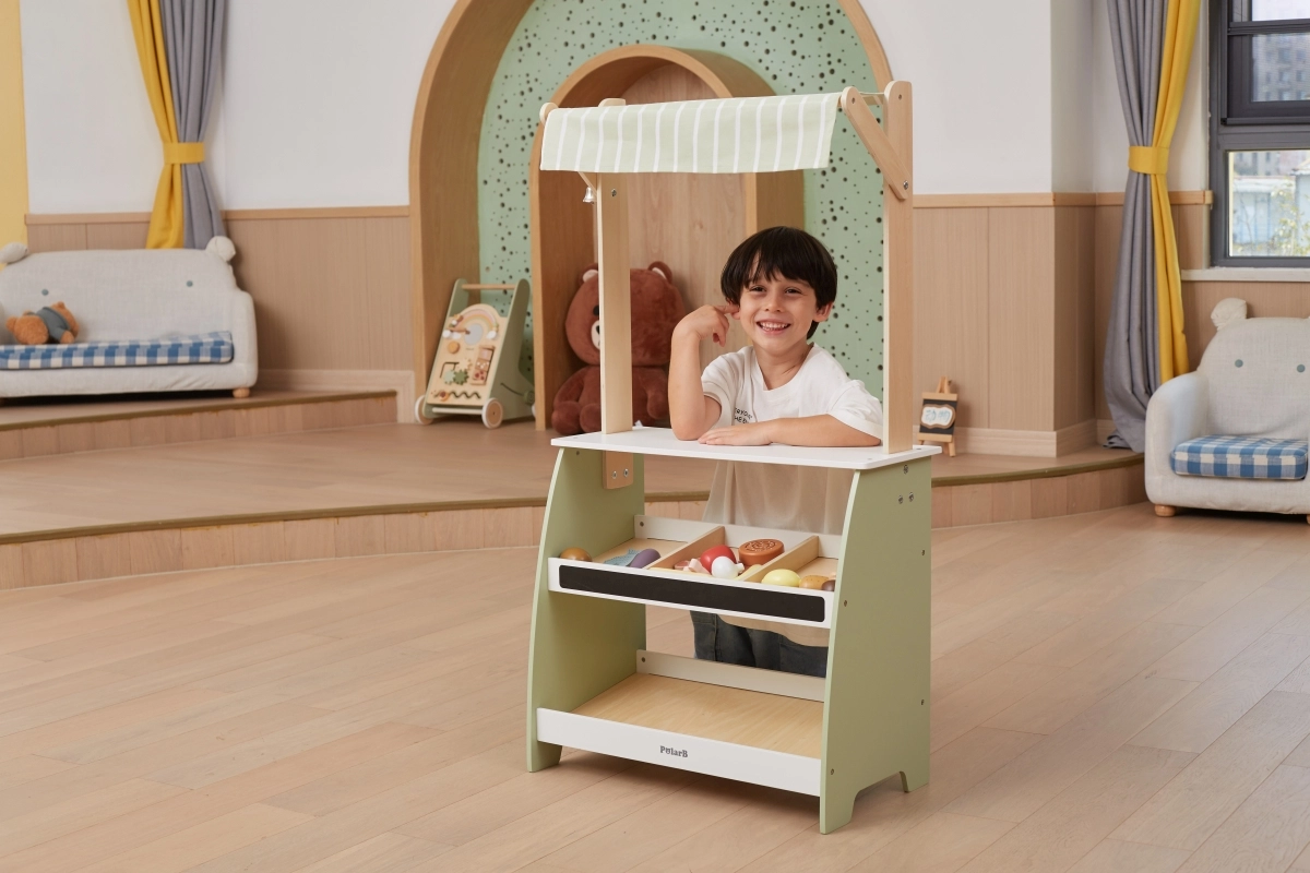 Ο ξύλινος πάγκος προσφέρει άφθονο χώρο για διάφορα είδη παιχνιδιών, καθιστώντας τον ιδανικό για παιχνίδια καταστήματος ή λαϊκής αγοράς.
