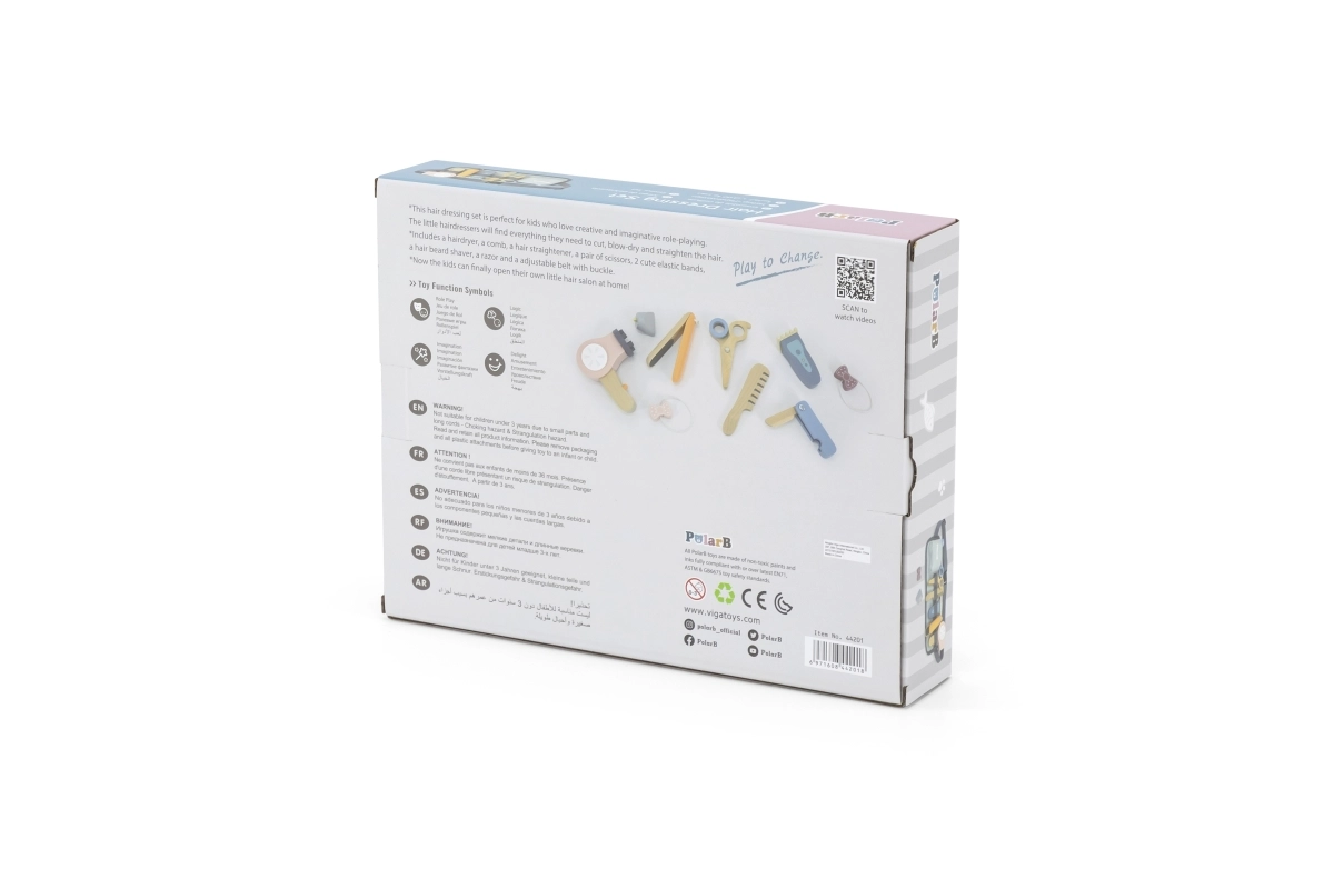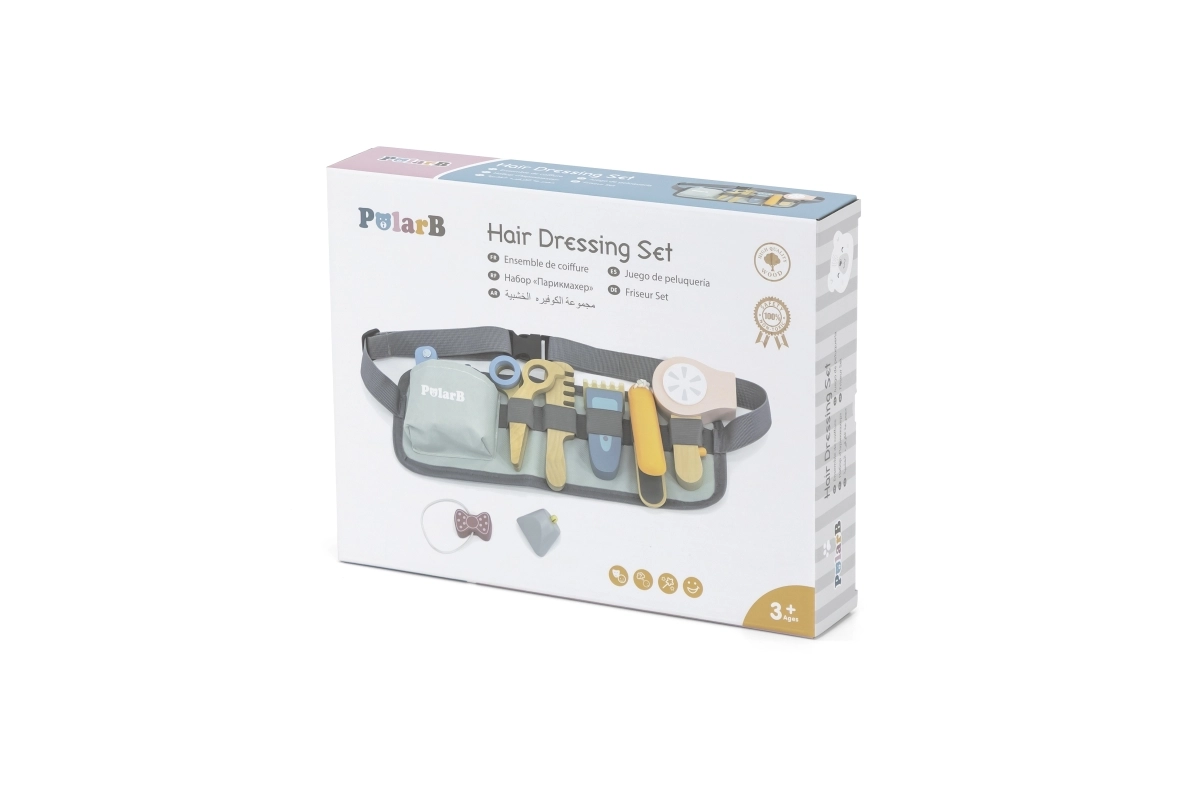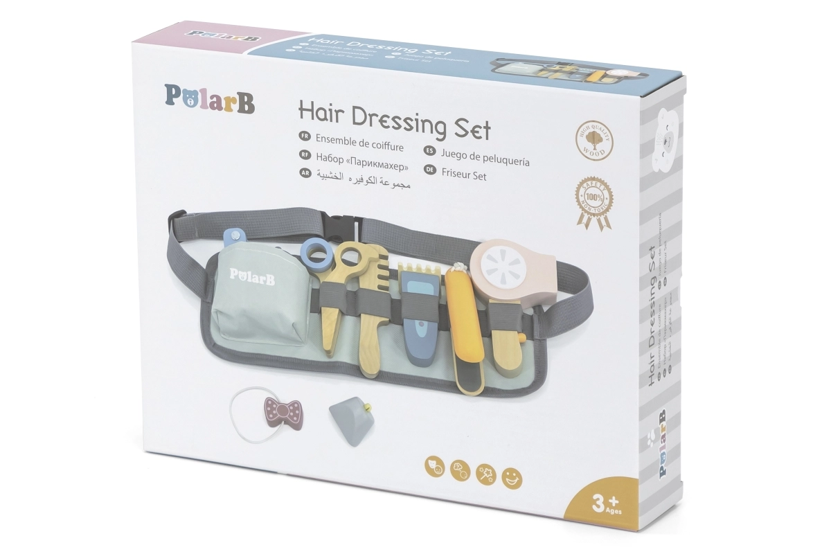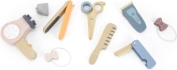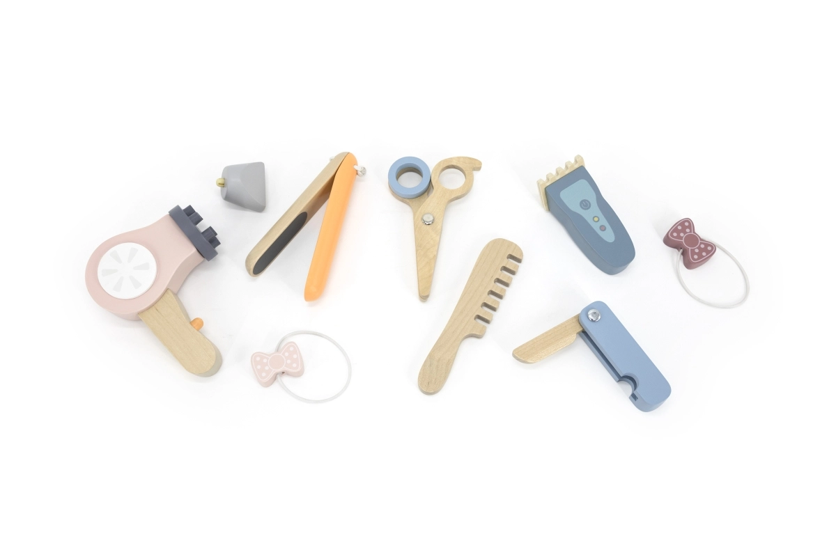 Χάρη στα διάφορα ξύλινα εργαλεία όπως ψαλίδι, χτένα και πιστολάκι, αυτό το σετ προσφέρει ό,τι χρειάζεται για δημιουργικό παιχνίδι ρόλων κομμωτή.
