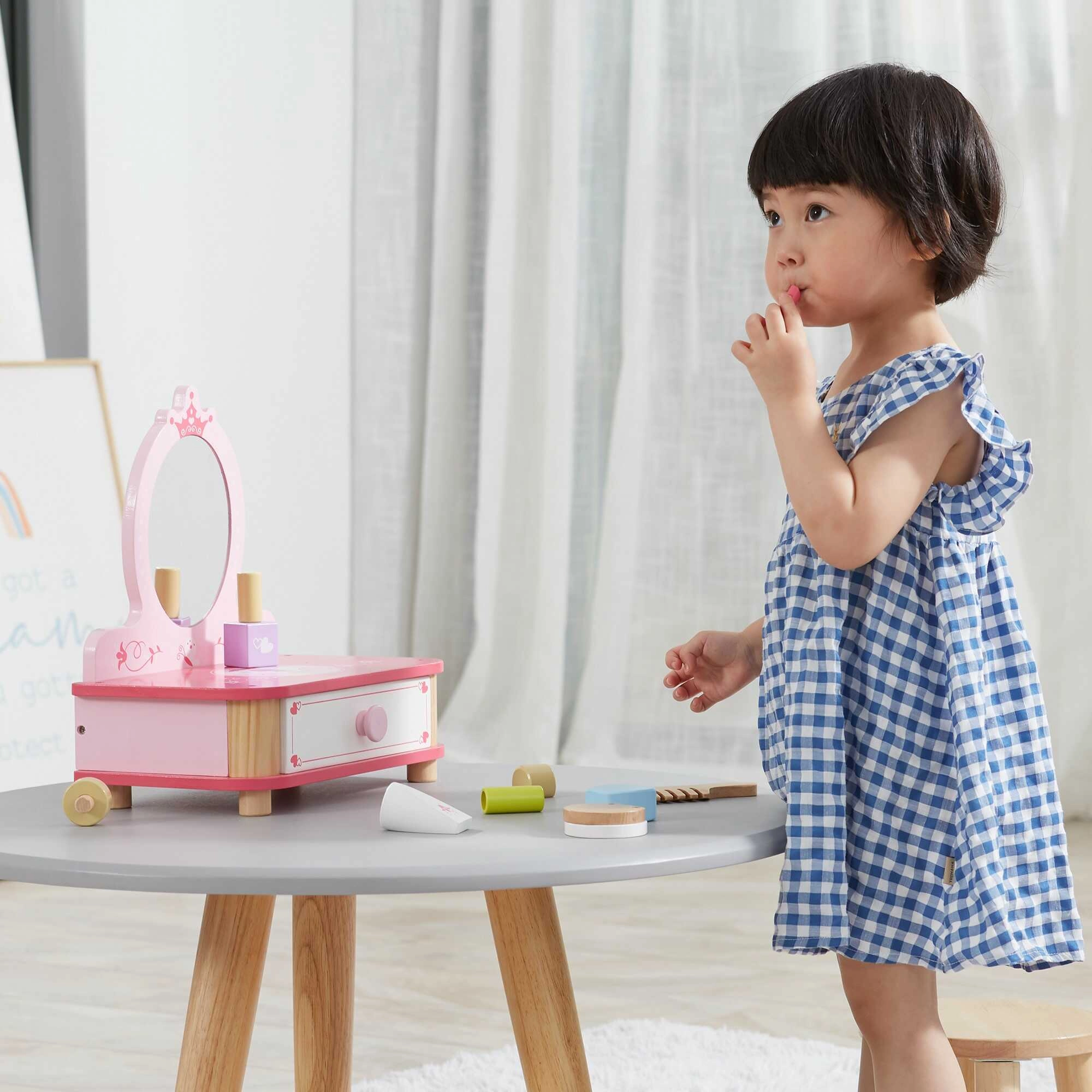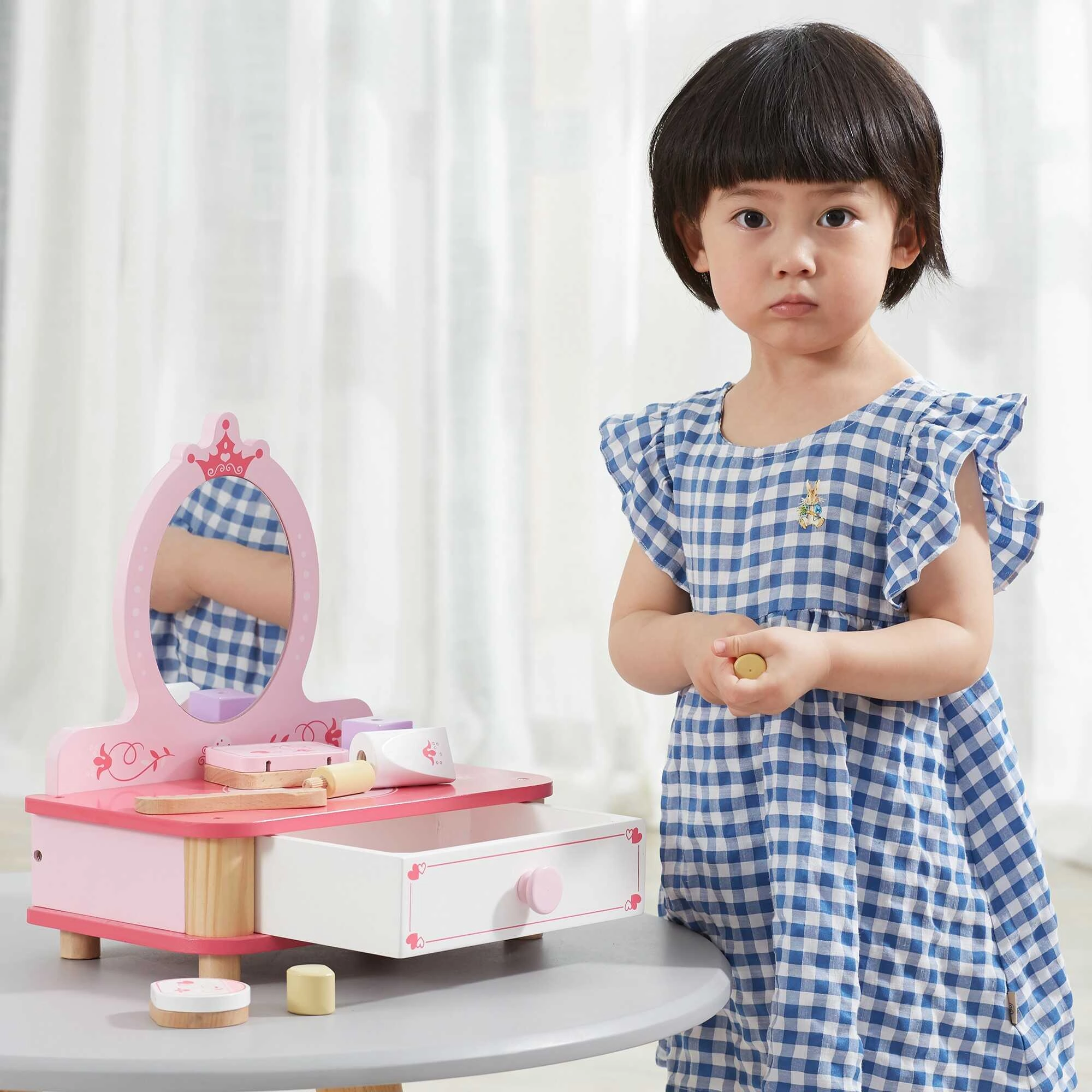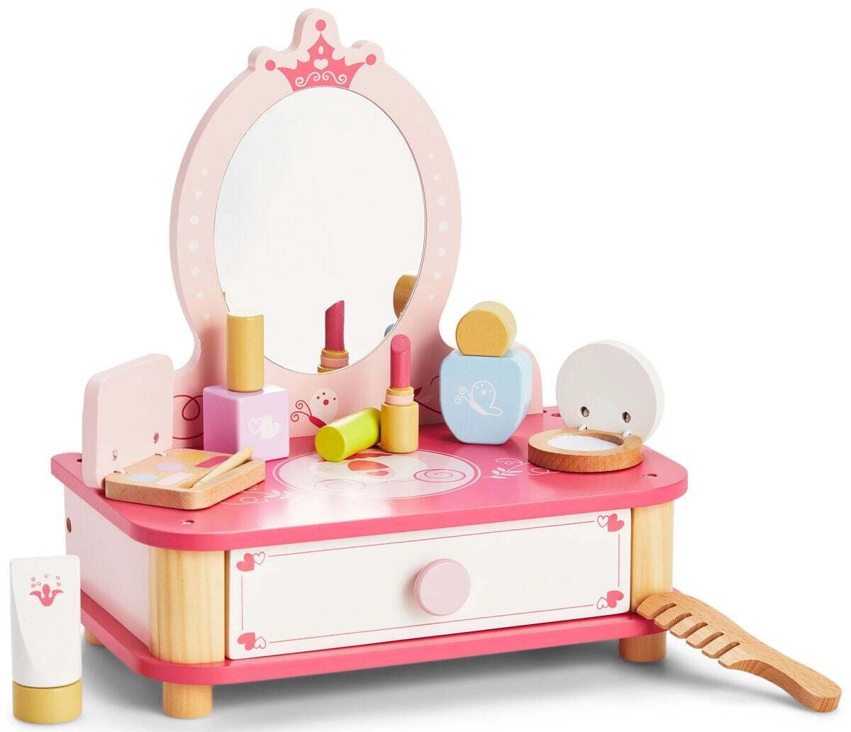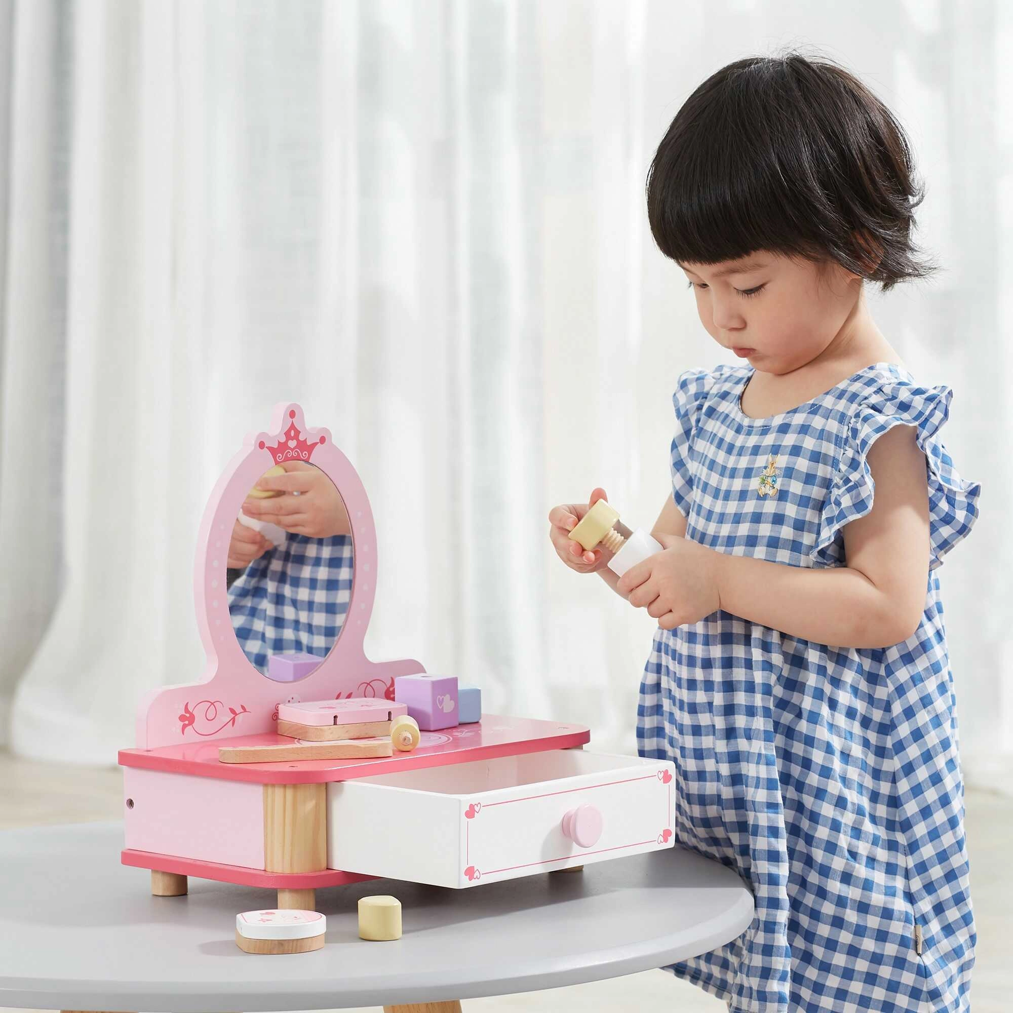 Το σετ περιλαμβάνει ξύλινα αξεσουάρ όπως κραγιόν, αρώματα και σκιές ματιών για τη δημιουργία ατελείωτων σεναρίων παιχνιδιού.