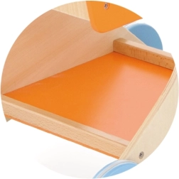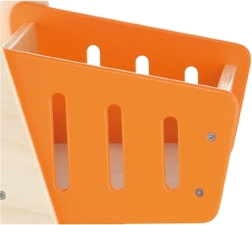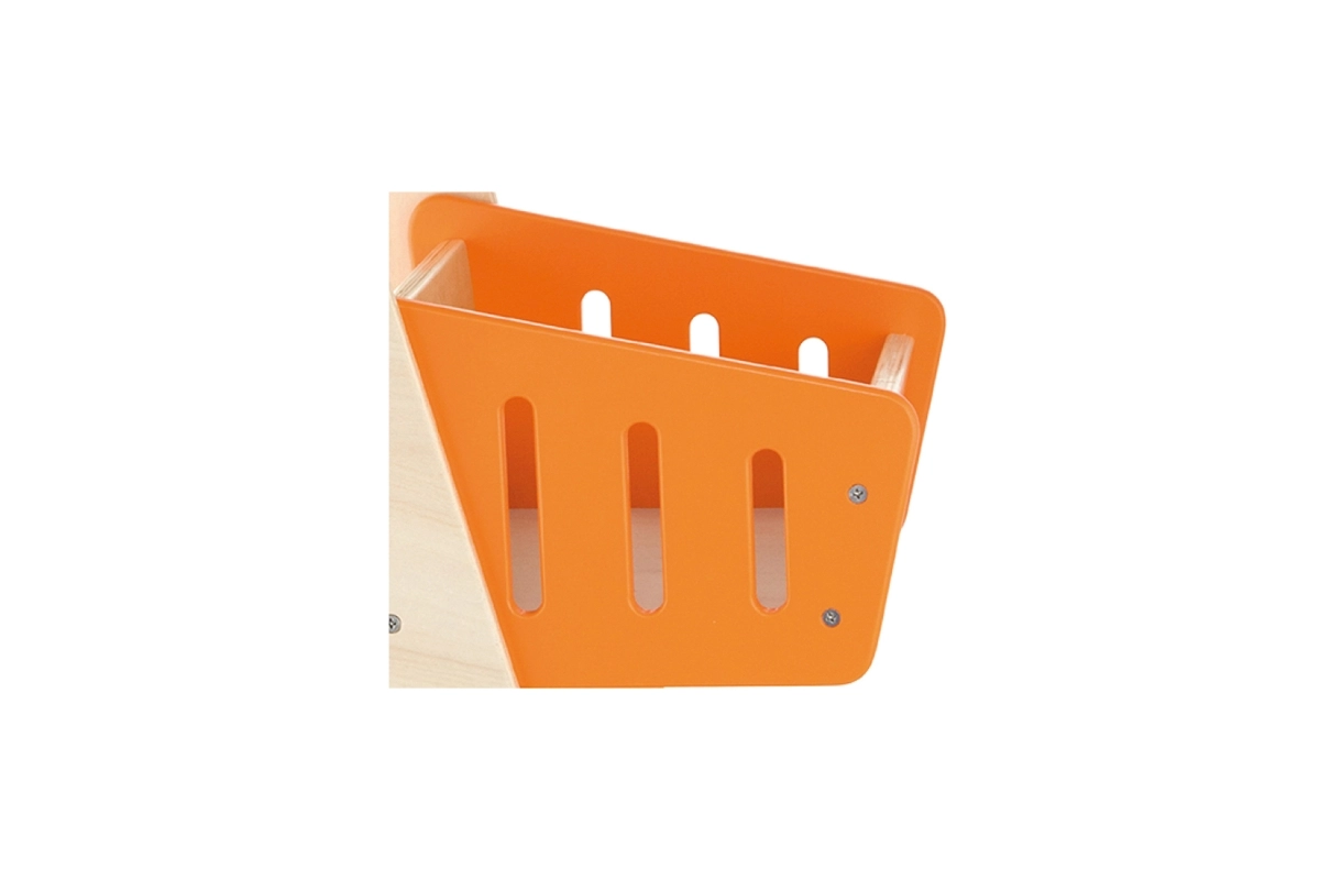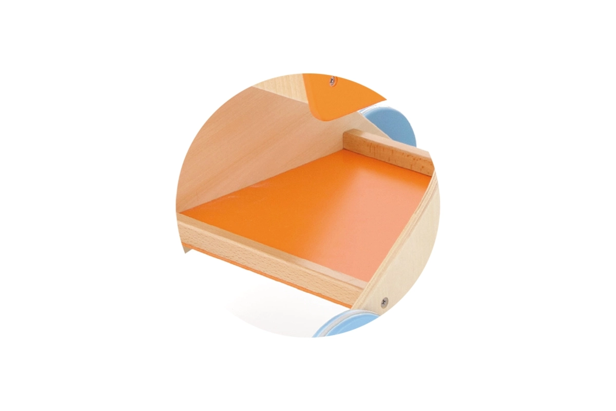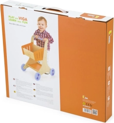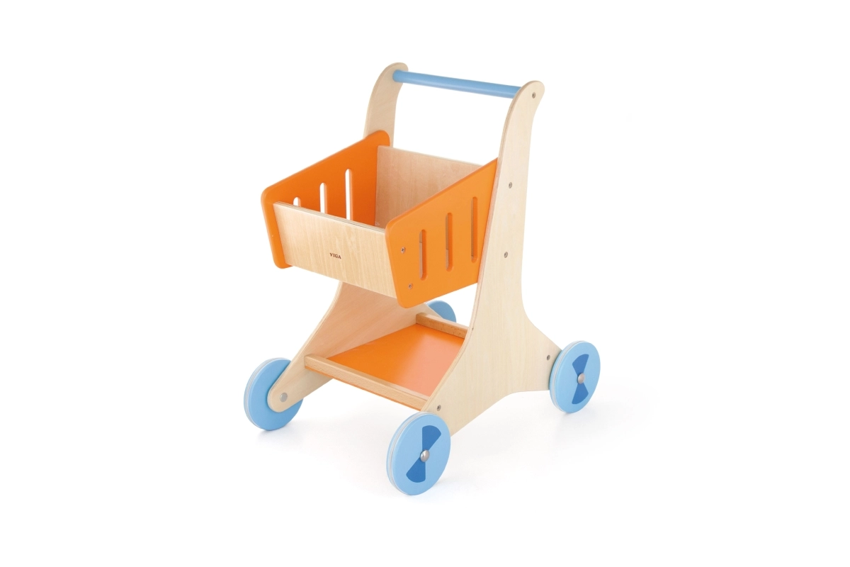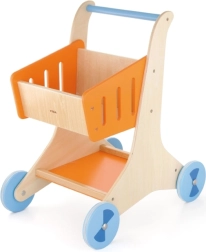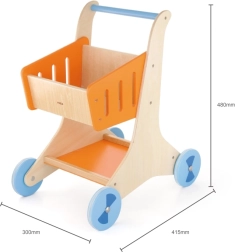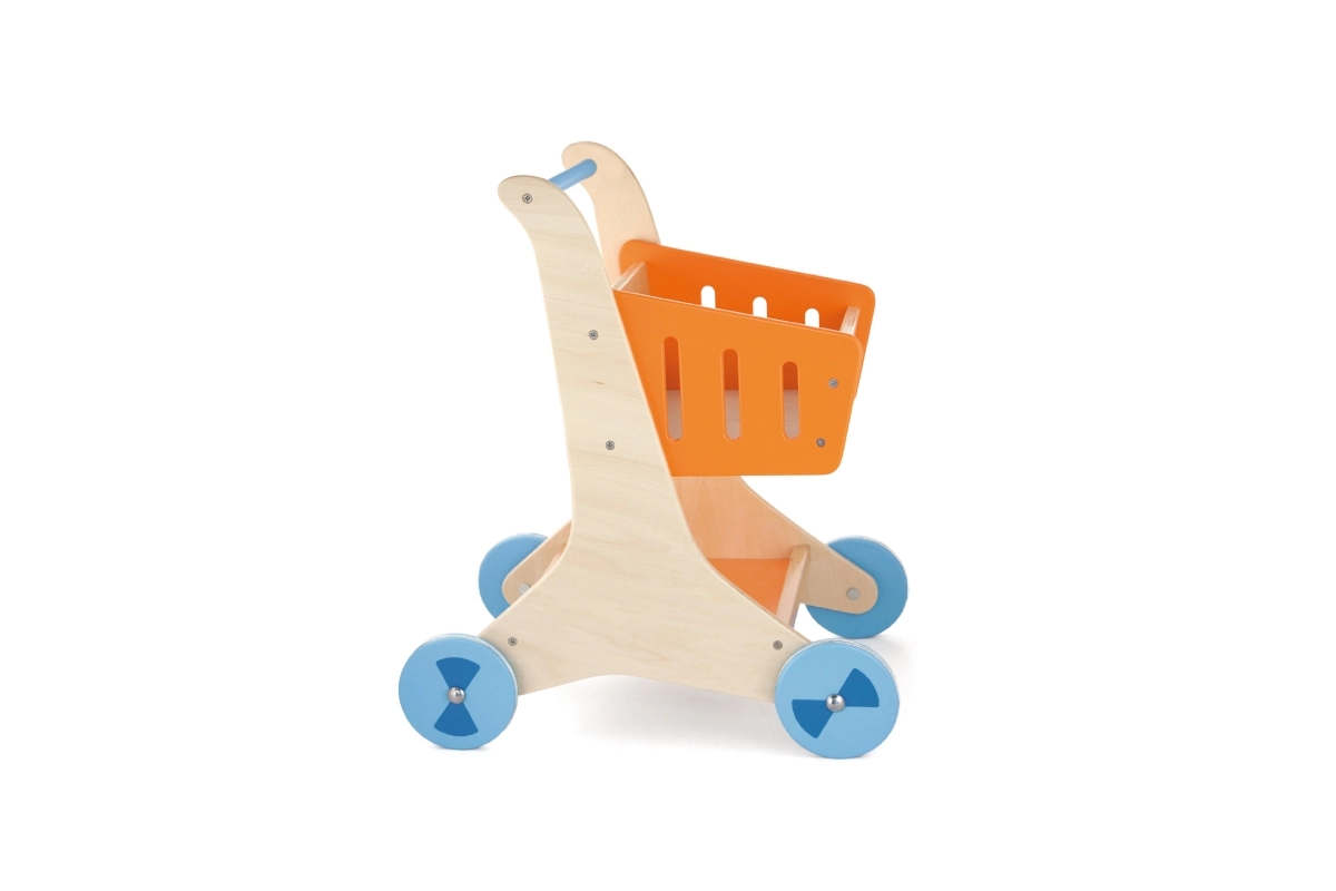 Στιλάτο ξύλινο καρότσι αγορών με πορτοκαλί καλαθάκι και μπλε ροδάκια, ιδανικό για τα πρώτα βήματα στον κόσμο του παιχνιδιού ρόλων. Υποστηρίζει την ανάπτυξη της αδρής κινητικότητας, της ισορροπίας και της δημιουργικής φαντασίας. Ελαφριά, σταθερή κατασκευή με λεία άκρα, ασφαλής για παιδιά από 12 μηνών.