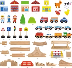 Πλήρες σετ που περιλαμβάνει ράγες, γέφυρα, μπάρες, 2 τρενάκια, οχήματα, φιγούρες και ζωάκια – όλα για τη δημιουργία μιας ζωντανής πόλης και φύσης.