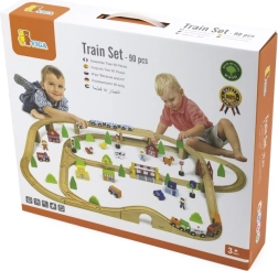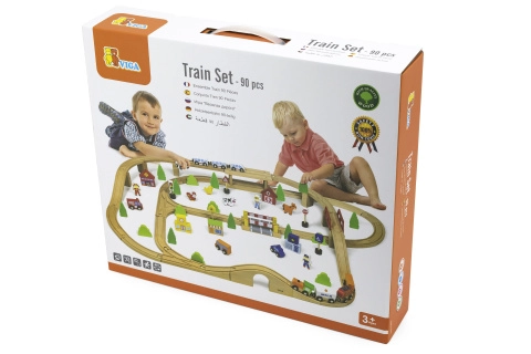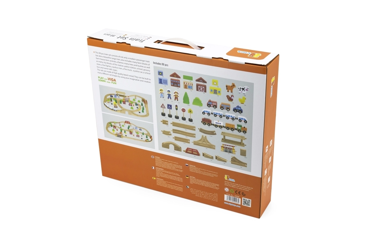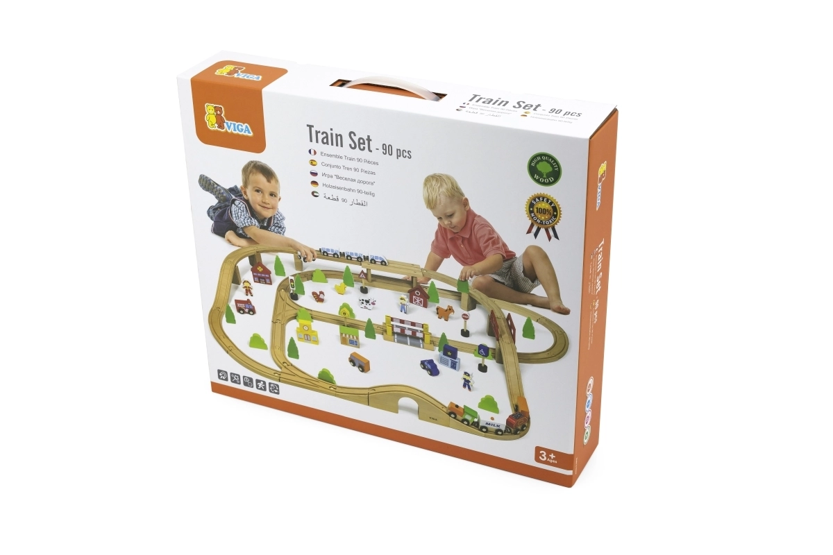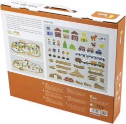 Αυτή η ολοκληρωμένη ξύλινη σιδηροδρομική πίστα προσφέρει στα παιδιά ό,τι χρειάζονται για να δημιουργήσουν τον δικό τους μικρό κόσμο. Με 90 κομμάτια, οι μικροί κατασκευαστές μπορούν να συνδυάζουν διάφορα σχήματα ραγών, γέφυρες και διασταυρώσεις, να προσθέτουν οχήματα, φιγούρες και στοιχεία φύσης. Το φυσικό ξύλο σε συνδυασμό με έντονα χρώματα δημιουργεί διαχρονική αισθητική και ενισχύει τη αισθητηριακή αντίληψη.