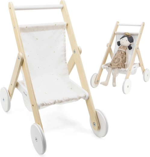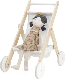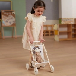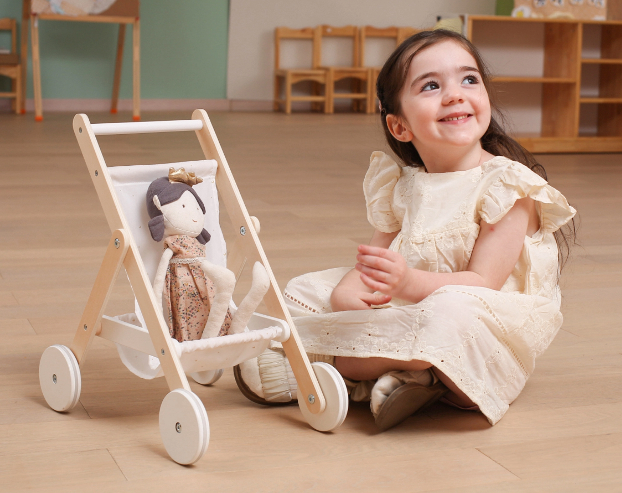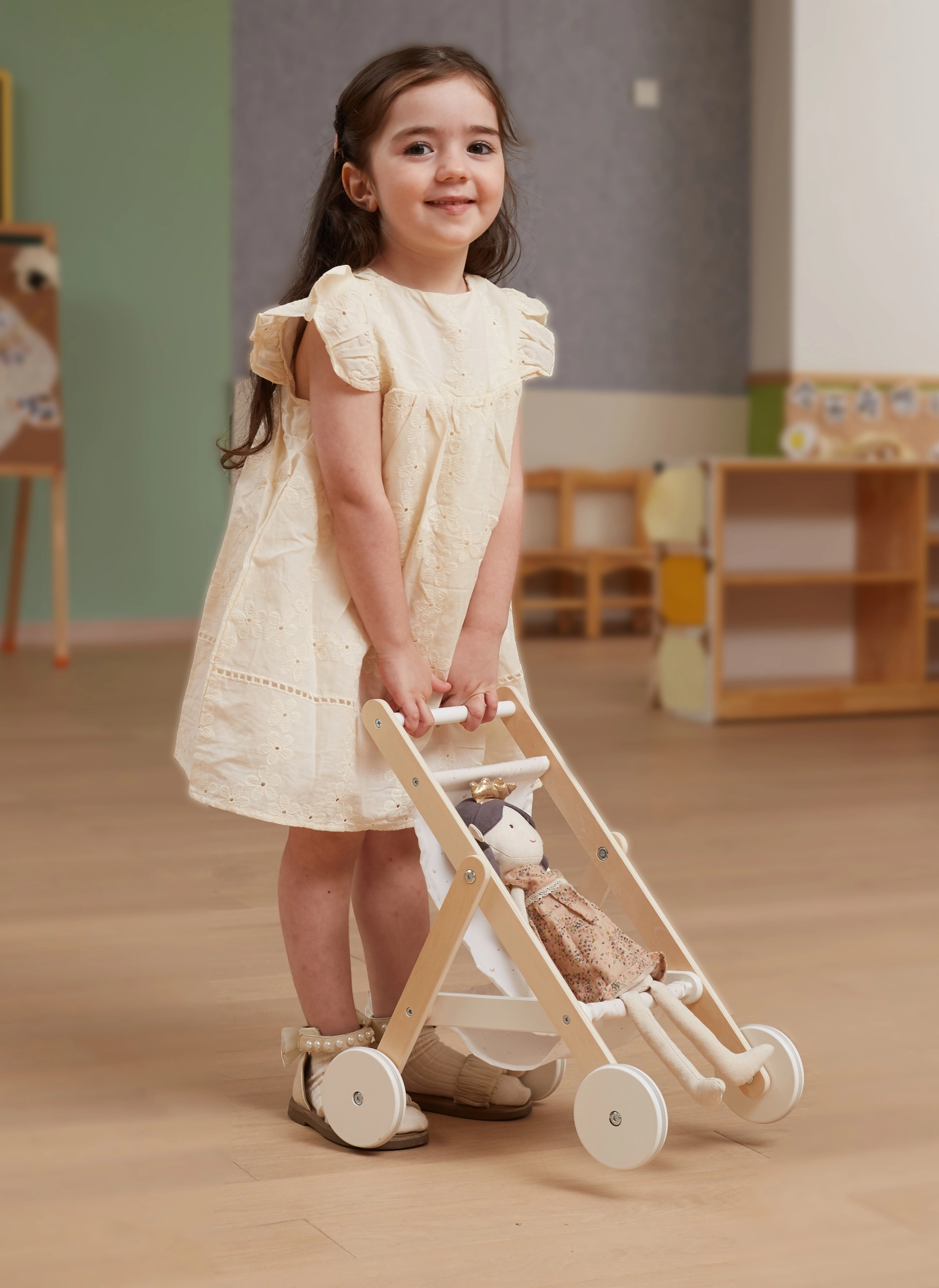Προσφέρετε στα παιδιά ρεαλιστικό παιχνίδι ρόλων με το κομψό ξύλινο καροτσάκι για κούκλες. Συνδυάζει διαχρονικό σχεδιασμό, ποιοτικά υλικά και ασφαλή κατασκευή ώστε κάθε «βόλτα» με την κούκλα να είναι άνετη και αθόρυβη. Τα ελαστικά πέλματα στους τροχούς μειώνουν τον θόρυβο στο πάτωμα και βελτιώνουν τη σταθερότητα στα πρώτα βηματάκια.