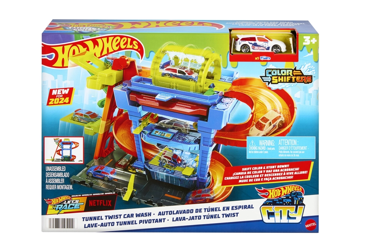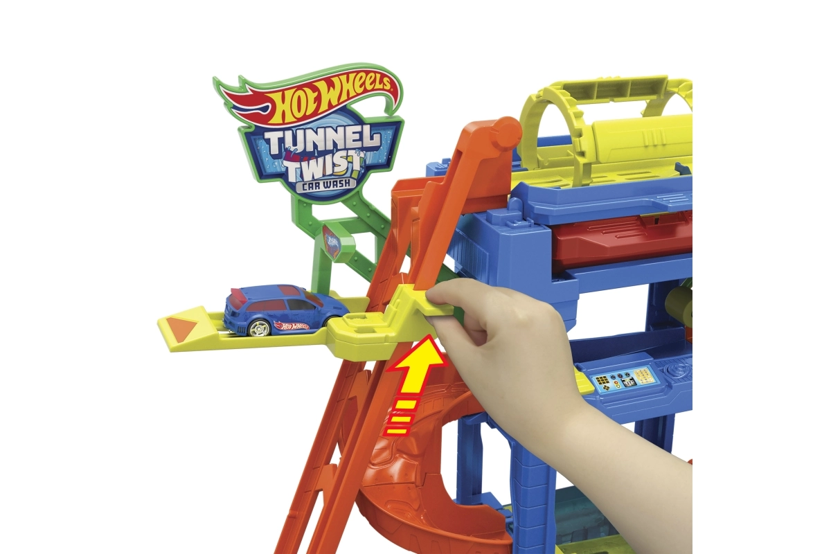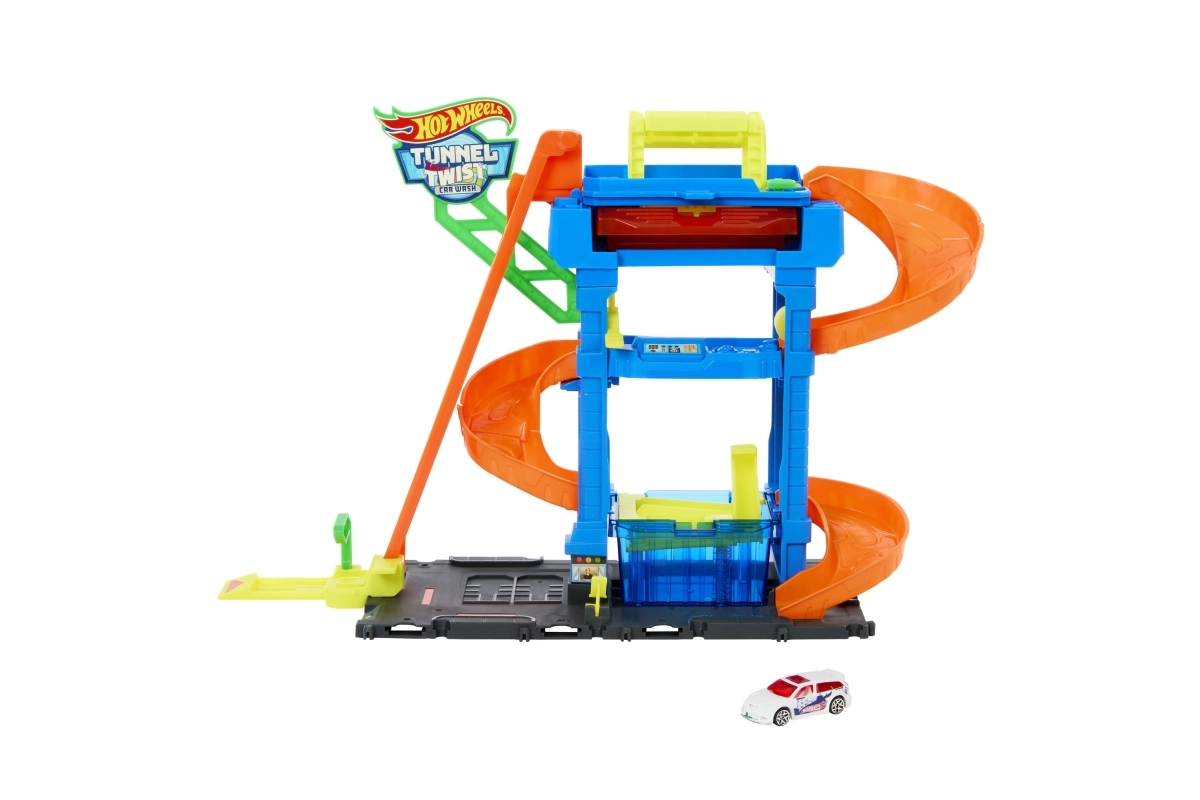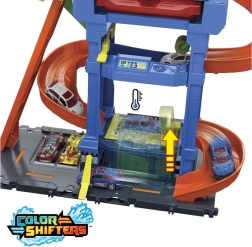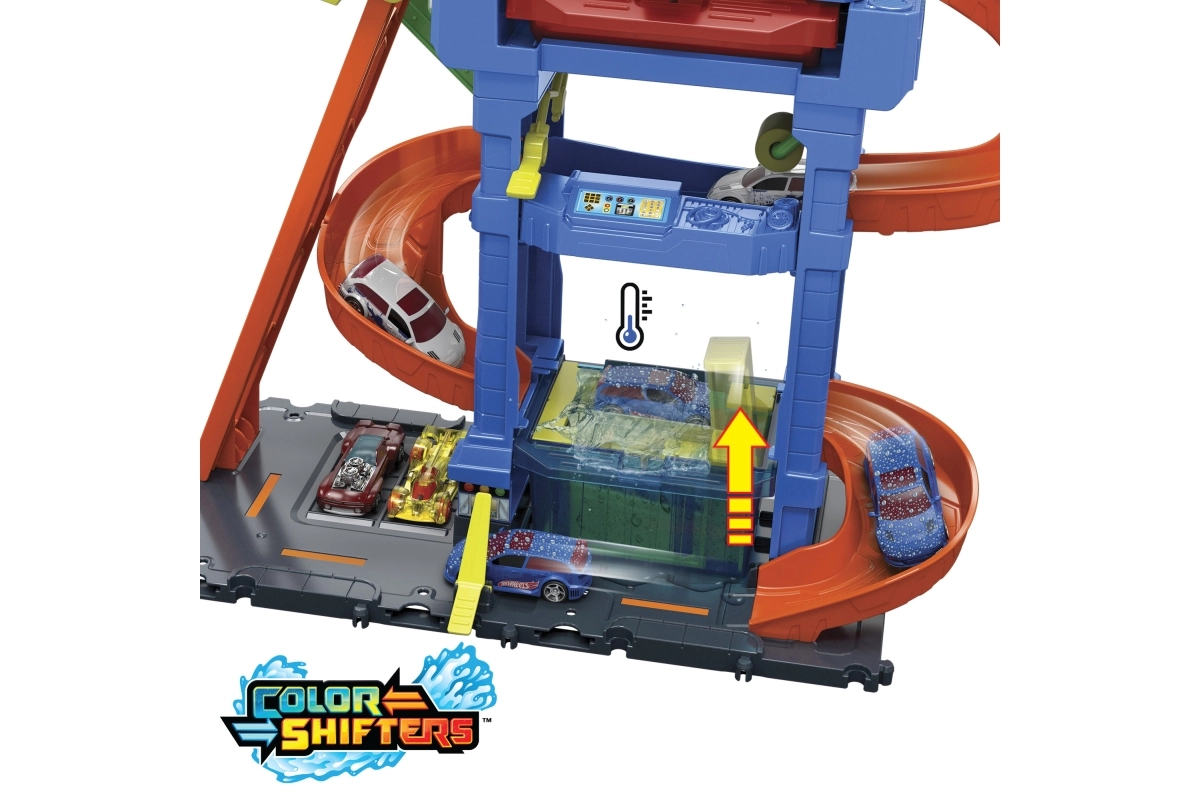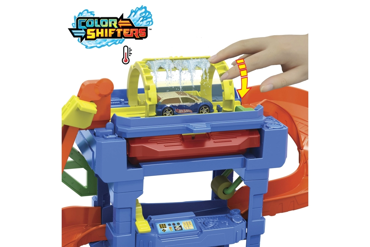 Το πλυντήριο αυτοκινήτων Hot Wheels City Color Shifters με περιστρεφόμενο τούνελ προσφέρει δράση γεμάτη πολύχρωμες μεταμορφώσεις και διαδραστικά στοιχεία. Τα παιδιά μπορούν να ανεβάσουν το αυτοκινητάκι με τον χειροκίνητο ανελκυστήρα στον επάνω όροφο και να δουν πώς αλλάζει αμέσως η εμφάνισή του στο ζεστό νερό. Έπειτα κατεβαίνουν τη ράμπα μέσα από τον κύλινδρο αφρού και στο «detailing» ρυθμίζουν τα πάντα μέχρι το τελευταίο διασκεδαστικό βήμα.