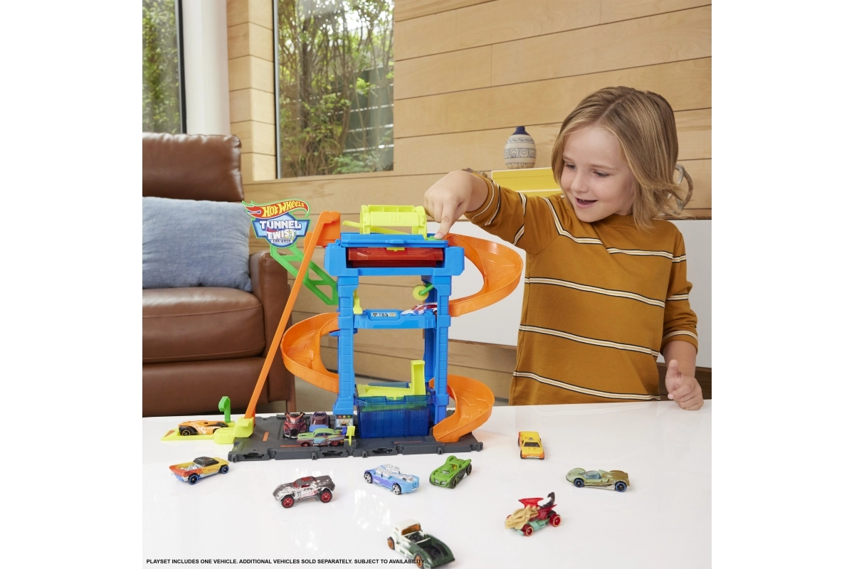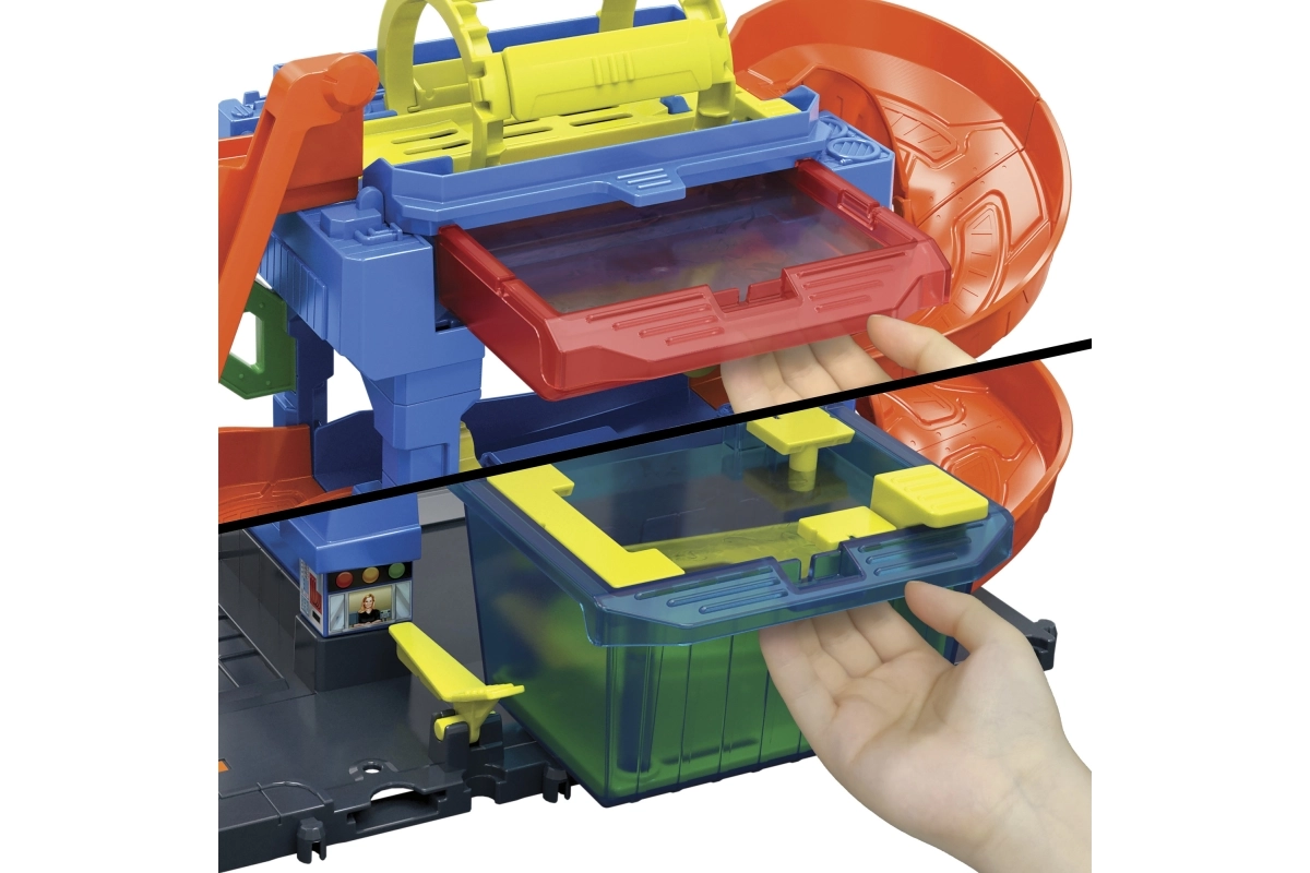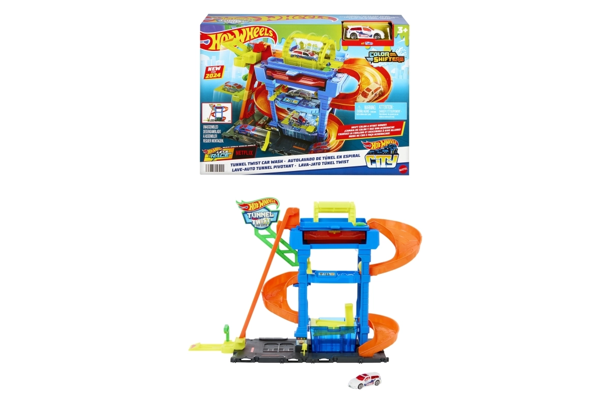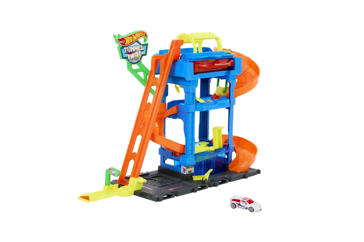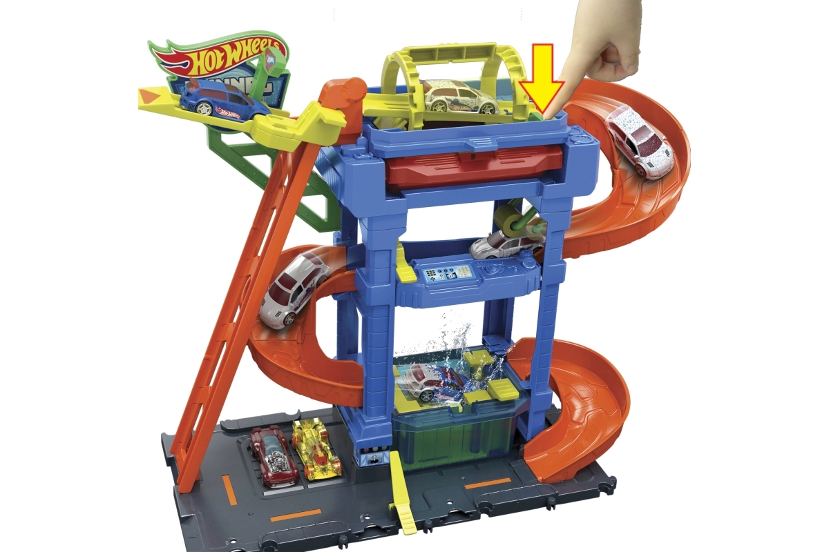 Το πλυντήριο αυτοκινήτων Hot Wheels City Color Shifters με περιστρεφόμενο τούνελ προσφέρει δράση γεμάτη πολύχρωμες μεταμορφώσεις και διαδραστικά στοιχεία. Τα παιδιά μπορούν να ανεβάσουν το αυτοκινητάκι με τον χειροκίνητο ανελκυστήρα στον επάνω όροφο και να δουν πώς αλλάζει αμέσως η εμφάνισή του στο ζεστό νερό. Έπειτα κατεβαίνουν τη ράμπα μέσα από τον κύλινδρο αφρού και στο «detailing» ρυθμίζουν τα πάντα μέχρι το τελευταίο διασκεδαστικό βήμα.
