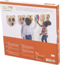 Έμφαση στην ασφάλεια και την ποιότητα: το προϊόν είναι από ανθεκτικό, λακαρισμένο ξύλο και βαμμένο με μη τοξικά, ζωηρά χρώματα. Το παιχνίδι καλλιεργεί φυσικά τη λεπτή κινητικότητα, τις δεξιότητες συντονισμού, τη λογική σκέψη και βοηθά στην αναγνώριση χρωμάτων. Διατίθεται ολόκληρη σειρά επιτοίχιων πινάκων σε σχήμα αρκουδιού με διαφορετικές λειτουργίες – ιδανικοί για μια αρθρωτή αισθητηριακή γωνιά.