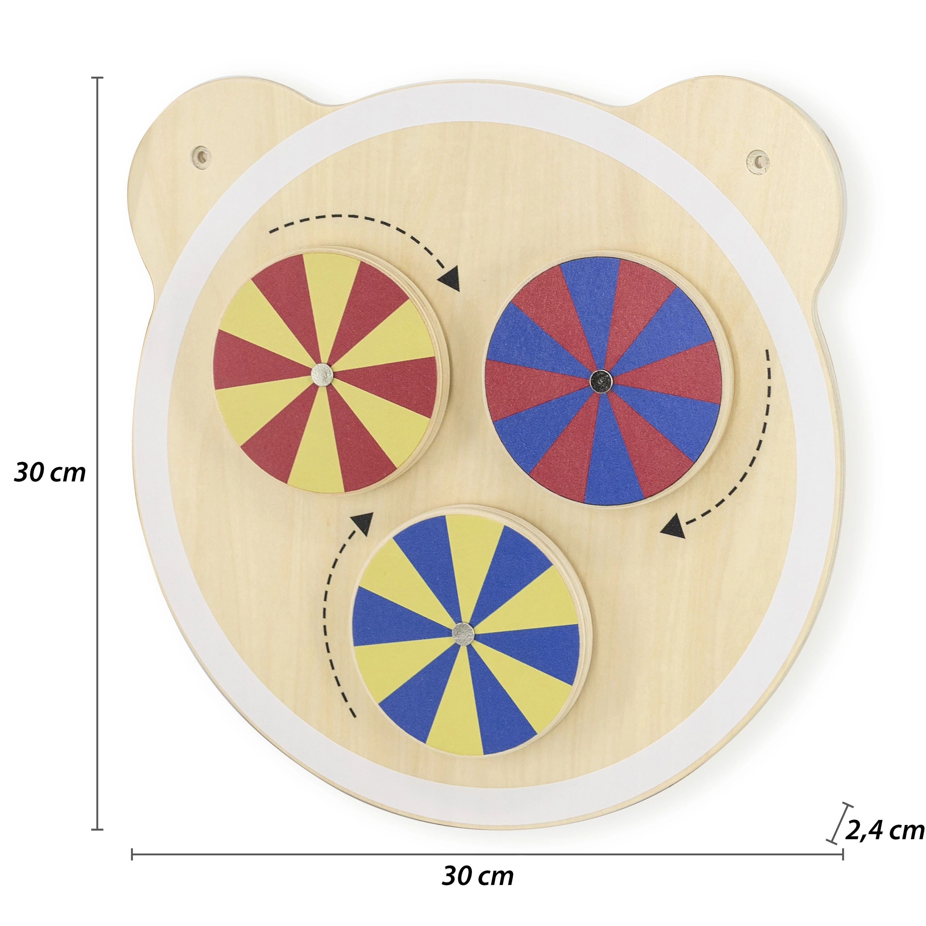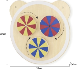 Ο ξύλινος πίνακας με το χαριτωμένο κεφαλάκι αρκουδιού μεταμορφώνει κάθε παιδική γωνιά σε δημιουργικό χώρο παιχνιδιού. Οι τρεις πολύχρωμοι δίσκοι περιστρέφονται εύκολα, προσφέροντας εντυπωσιακά οπτικά εφέ που συναρπάζουν τα παιδιά και τα ενθαρρύνουν σε περαιτέρω εξερεύνηση. Ο πίνακας είναι ιδανικός για παιδικό δωμάτιο, νηπιαγωγεία και χώρους παιχνιδιού.