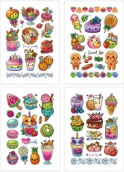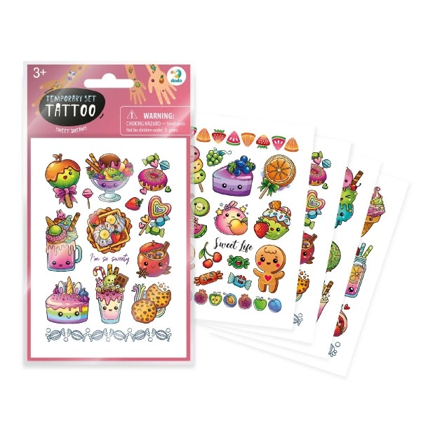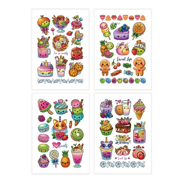 Διακοσμήστε το σώμα σας με όμορφα, πολύχρωμα τατουάζ με μοτίβα από αγαπημένα γλυκίσματα. Εύκολη εφαρμογή και αφαίρεση! 4 φύλλα τατουάζ προσφέρουν μεγάλη ποικιλία σχεδίων.