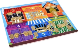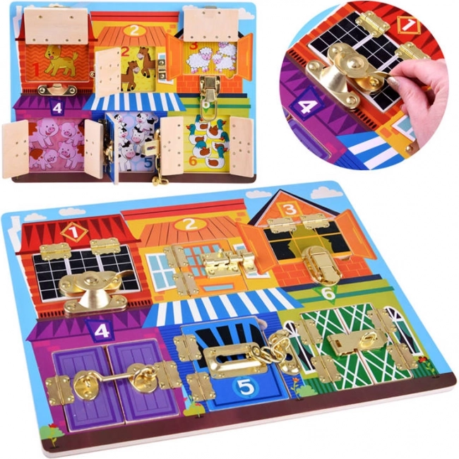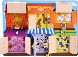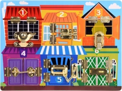 Αυτός ο διαδραστικός πίνακας χειρισμού προσφέρει στα παιδιά άφθονο παιχνίδι και μάθηση μαζί. Κάθε χρωματιστό σπιτάκι φέρει αριθμό και κρύβει πίσω από το πορτάκι ζωάκια σε ποσότητα που αντιστοιχεί στον αριθμό. Έτσι τα παιδιά εξασκούν το μέτρημα, την αναγνώριση χρωμάτων και τη λογική σκέψη, ενώ το άνοιγμα διαφορετικών κλειδαριών ενισχύει τη λεπτή κινητικότητα και τον συντονισμό χεριού–ματιού.
