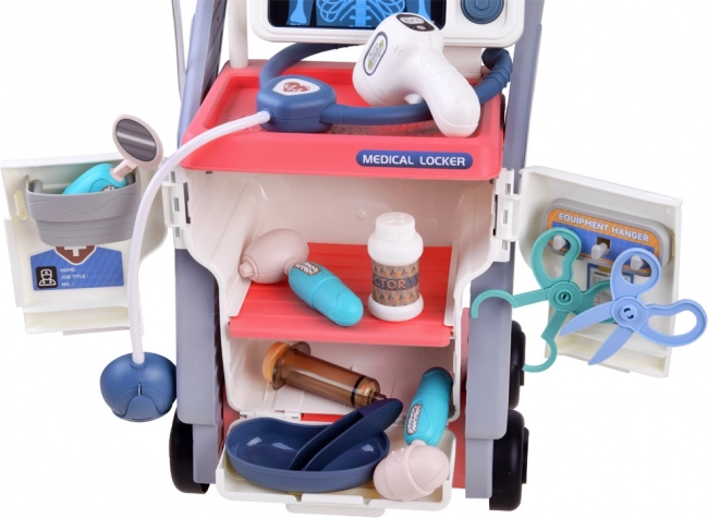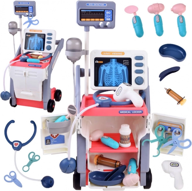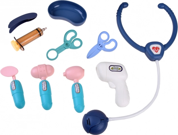 Το σετ περιλαμβάνει καρότσι με ροδάκια, στηθοσκόπιο, σταγονόμετρο, θερμόμετρο, ωτοσκόπιο, νευρολογικό σφυράκι, σύριγγα, καθρεφτάκι και άλλα.
