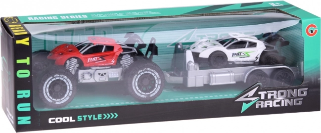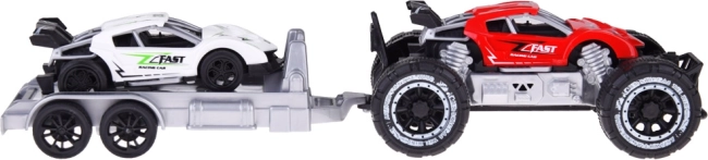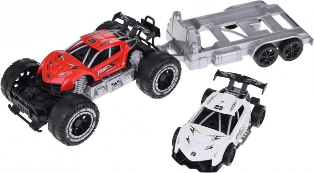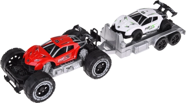 Τετρακίνητο αυτοκίνητο και σπορ αυτοκινητάκι με ρυμουλκούμενο προσφέρουν διασκέδαση για κάθε μικρό φίλο της αυτοκίνησης. Τα αυτοκινητάκια είναι κατασκευασμένα από πλαστικό, ενώ το ρυμουλκούμενο είναι ιδανικό για τη μεταφορά του σπορ αυτοκινήτου στους αγώνες.