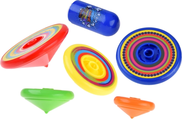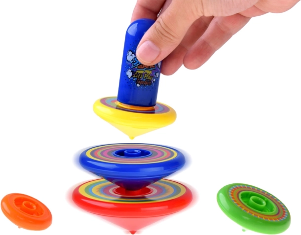 Πέντε σβούρες διαφορετικών μεγεθών προσκαλούν σε διαγωνισμούς για τη μεγαλύτερη διάρκεια περιστροφής και στη δημιουργία μιας διασκεδαστικής περιστρεφόμενης πυραμίδας.