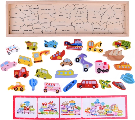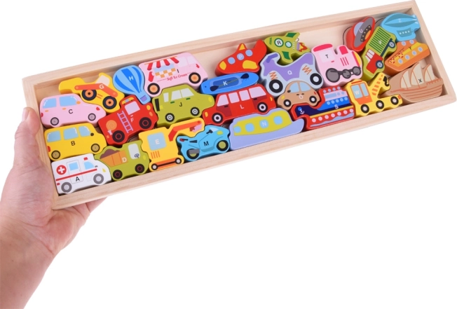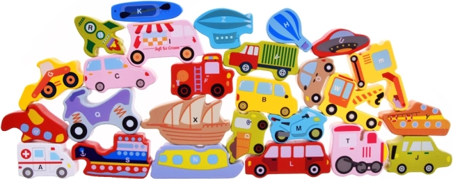 Αυτό το ξύλινο σετ περιλαμβάνει 27 πολύχρωμα οχήματα — από αυτοκίνητο, λεωφορείο και πυροσβεστικό όχημα έως αερόστατο, πλοίο, πύραυλο ή αερόπλοιο — και ξύλινη βάση με σημειωμένες ονομασίες. Κάθε κομμάτι φέρει γράμμα A–Z (συμπεριλαμβανομένου ειδικού μοτίβου), βοηθώντας τα παιδιά να μάθουν την αλφαβήτα με διασκεδαστικό τρόπο και να εμπλουτίσουν το λεξιλόγιό τους.