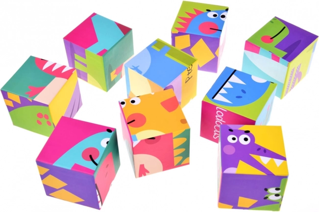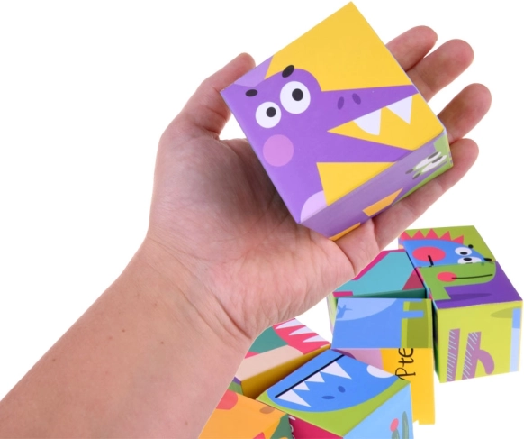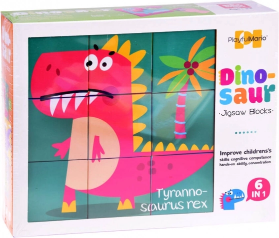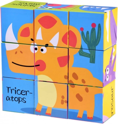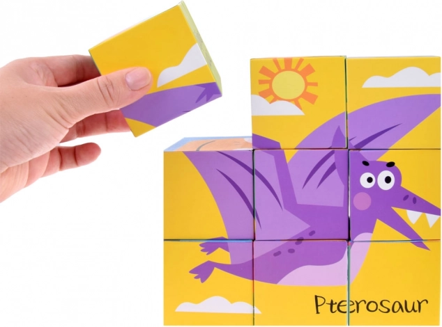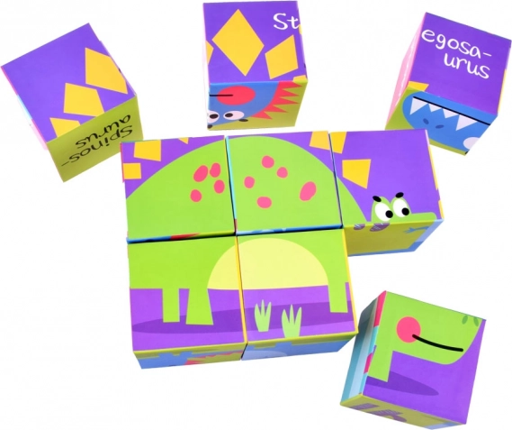 Εννέα κύβοι επιτρέπουν τη συναρμολόγηση έξι διαφορετικών εικόνων δεινοσαύρων με πολύχρωμες εικονογραφήσεις για εύκολη μάθηση.