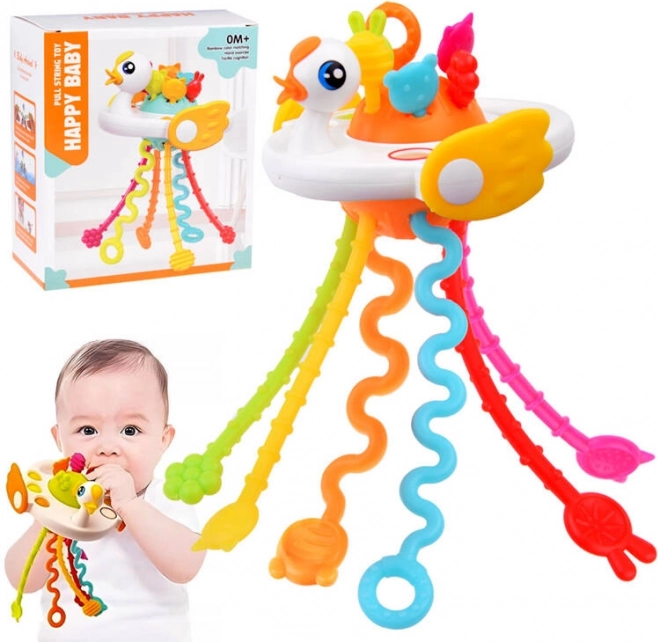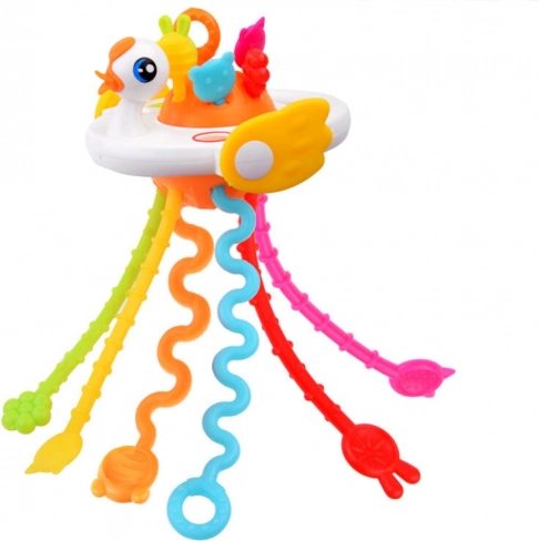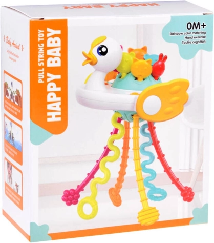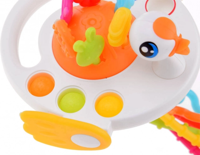 Χαριτωμένο αισθητηριακό παιχνίδι και μασητήρι σε σχήμα κύκνου που θα ενθουσιάσει τα μωρά από τις πρώτες ημέρες. Προσφέρει ποικίλες υφές, κορδονάκια για τράβηγμα με ήχο και απαλή δόνηση, μαλακά κουμπιά και συρόμενο στοιχείο για εξάσκηση της λεπτής κινητικότητας. Οι συμπαγείς διαστάσεις και οι ασφαλείς στρογγυλεμένες άκρες το καθιστούν ιδανικό παιχνίδι για το ταξίδι.