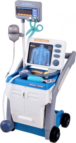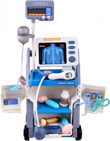 Αυτό το σταθερό ιατρικό καροτσάκι με ρόδες προσφέρει στα παιδιά ό,τι χρειάζονται για παιχνίδι «γιατρού»: μόνιτορ με κάρτες για «ακτινογραφία» και εξέταση όρασης, ντουλάπι αποθήκευσης με συρτάρι και πολλά ασφαλή πλαστικά εργαλεία σε φιλικά χρώματα. Ο διαδραστικός πίνακας, μετά την τοποθέτηση μπαταριών, παράγει ήχους παρακολούθησης ζωτικών λειτουργιών, το θερμόμετρο κάνει σύντομο μπιπ και ανάβει και το στηθοσκόπιο επιτρέπει να ακούγεται ο χτύπος της καρδιάς.